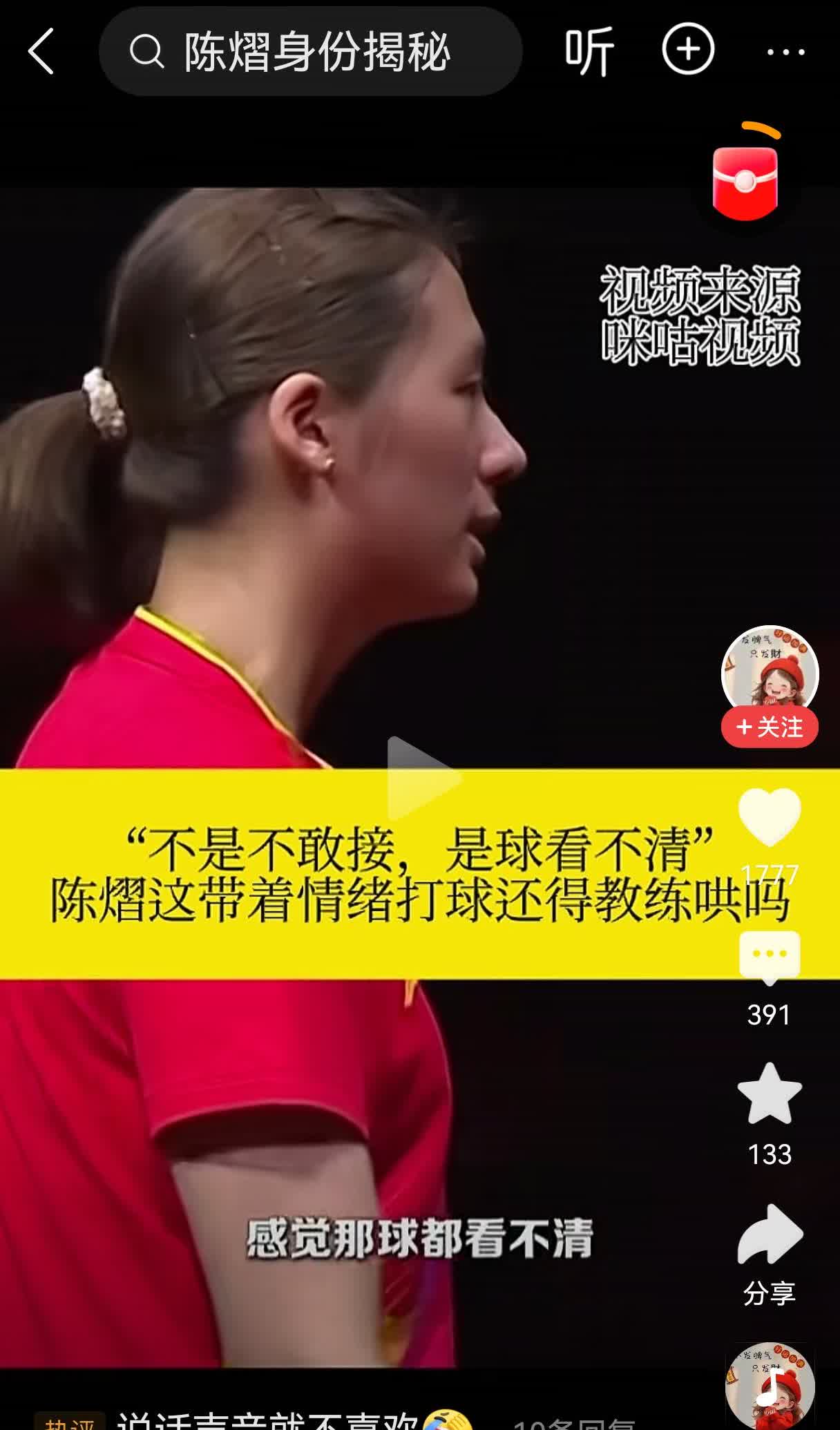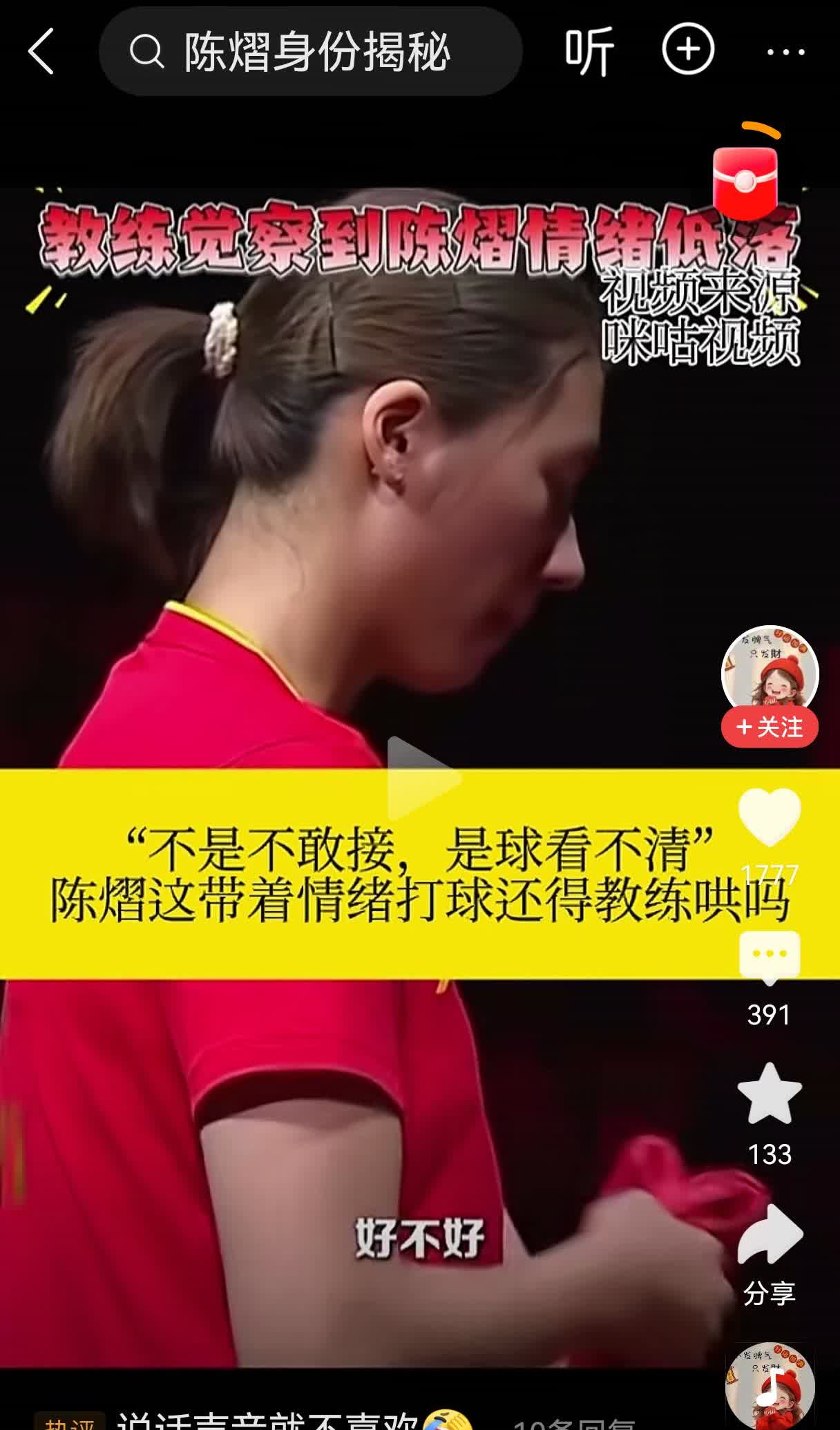 陈熠打朱雨玲,抱怨看不清朱雨玲发球,带着情绪打球能赢吗? 今天陈幸同打朱雨玲也接不好朱雨玲发球。而且朱雨玲球商特别高,用节奏旋转控制。陈熠有力气使不出感觉,情绪不好暂停跟徐辉抱怨。徐辉安慰她接发轮次接一个就行。 陈熠还是要稳定心态,不能打的不顺利了就带情绪打球。