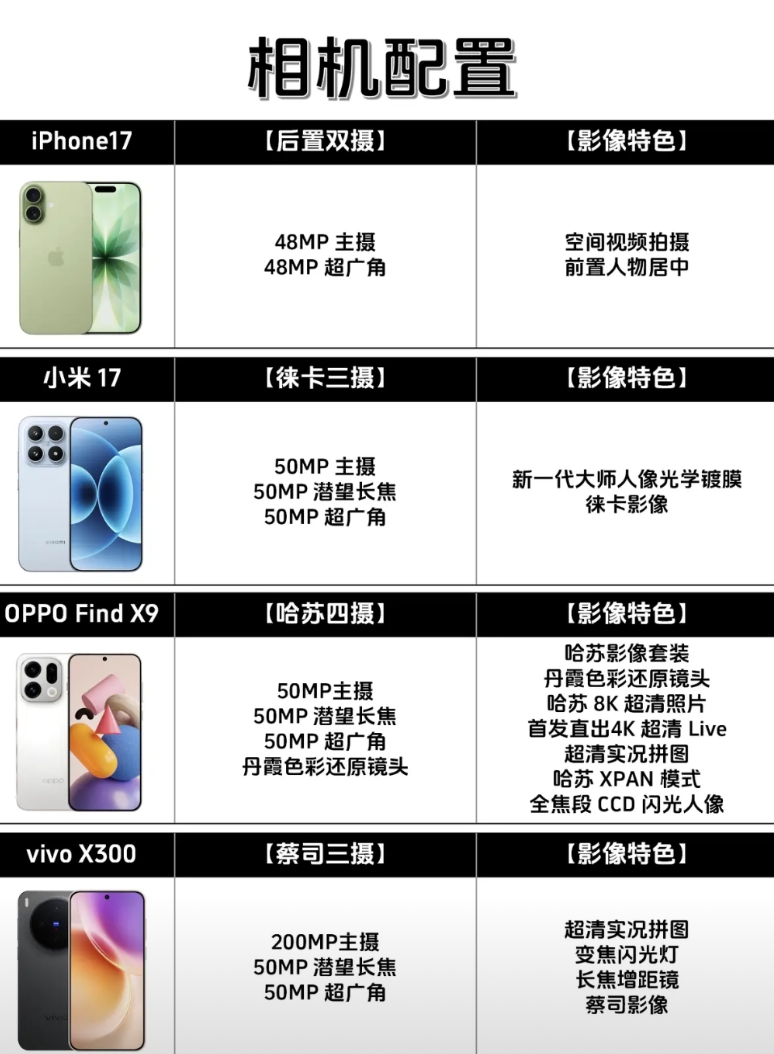 再看拍照,米OV都给了潜望长焦,小米17有徕卡大师影像,vivo x300有新蔡司影像,OPPO Find X9有全新哈苏大师影像,并且多一颗丹霞色彩还原镜头,拍照色彩还原更准。另外,OPPO Find X9还有4K画质超清live、原图直出8K超清照片、哈苏味更浓的全新XPAN、以及哈苏影像配件,感觉这次OPPO做了台“哈苏手机”,挺专业的样子!