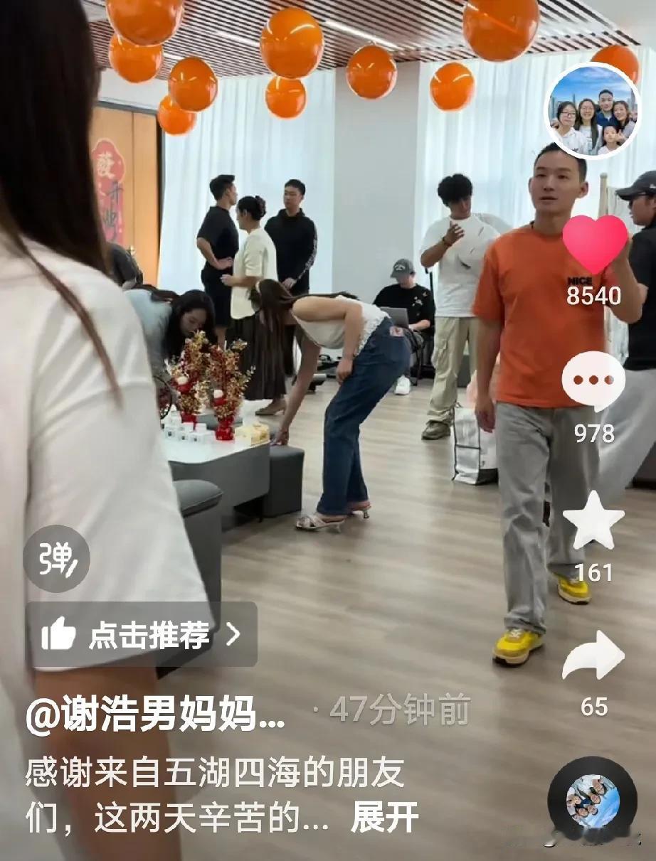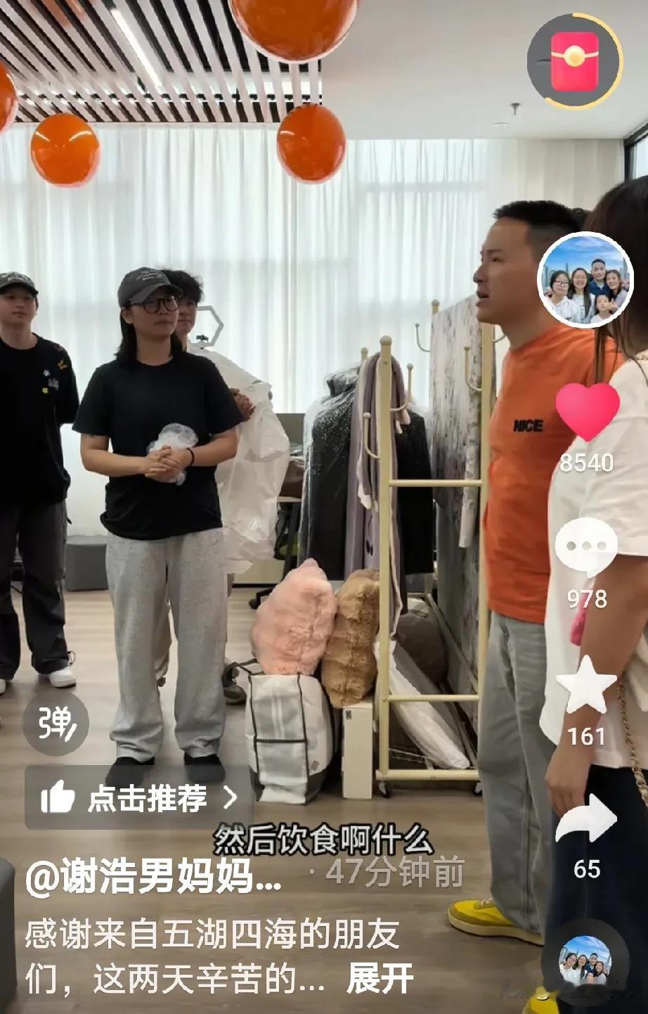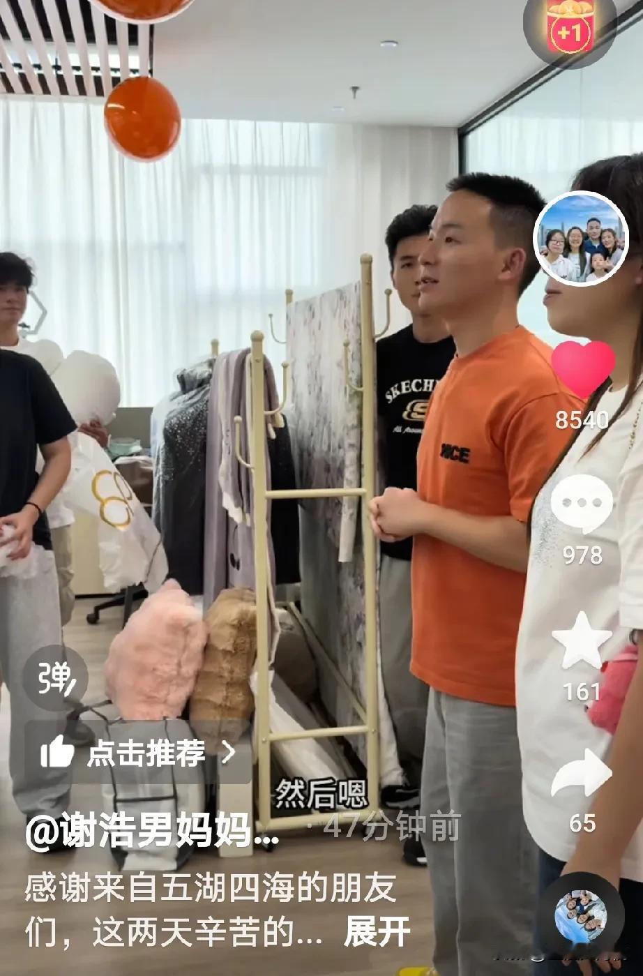 估计应付这样的场合只能有谢浩男了, 在就是谢浩男的爸爸。 刚刚看到谢浩男妈妈更新视频了, 视频里是她们家来了老多支持他们的朋友,和品牌方, 然而谢浩男一人代表做出重要的讲话, 有网友说,浩男发言的时候“然后然后”这个口头禅可以稍微注意一下[捂脸][捂脸] 我估计应该是紧张的问题吧,或许谢浩男这样的场合发言应该是第一次吧