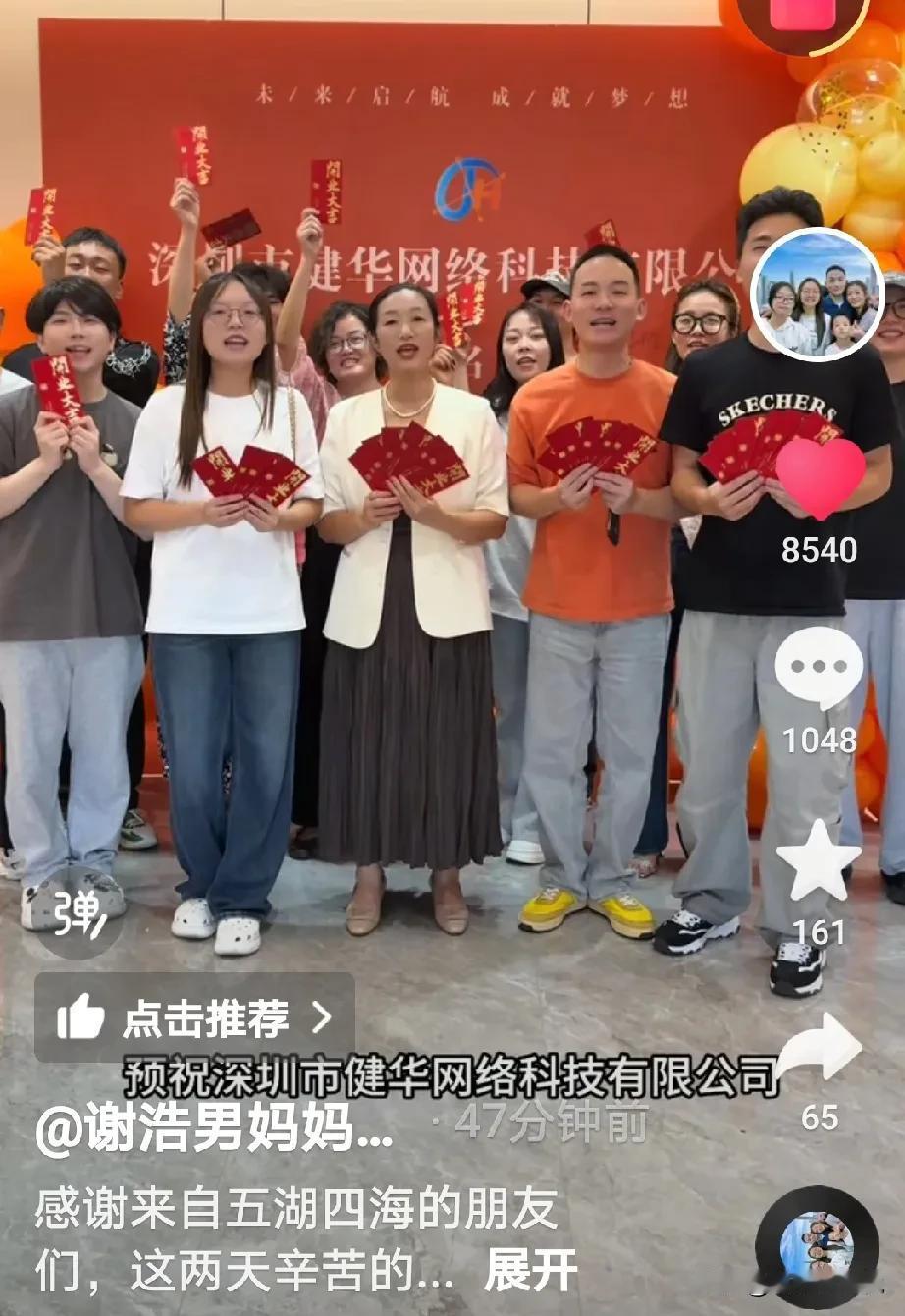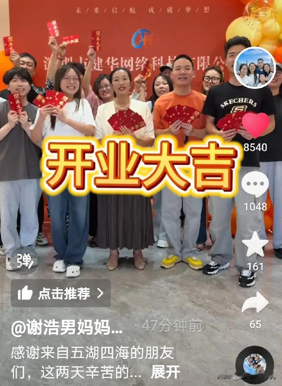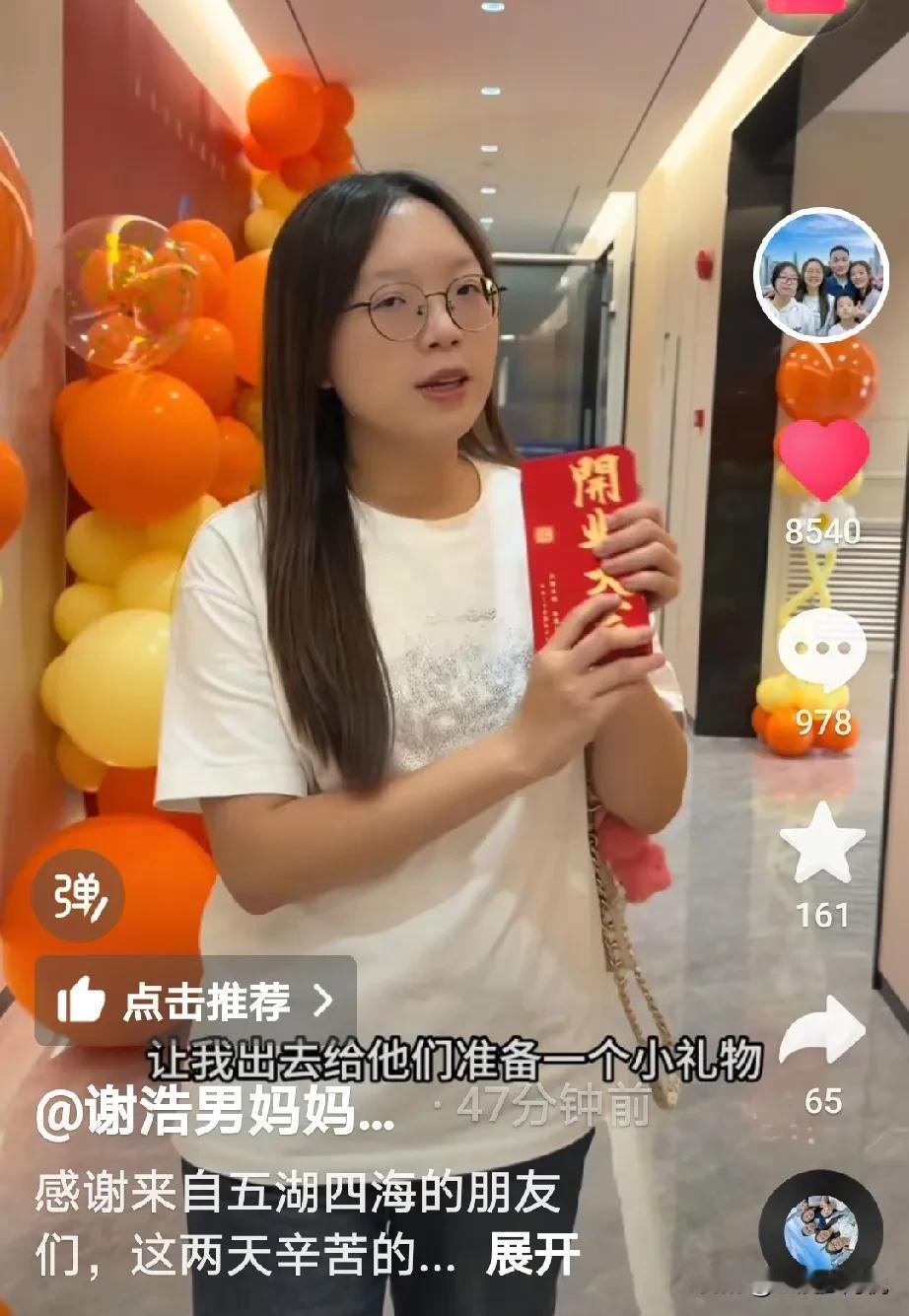 估计应付这样的场合只能有谢浩男了, 在就是谢浩男的爸爸。 刚刚看到谢浩男妈妈更新视频了, 视频里是她们家来了老多支持他们的朋友,和品牌方, 然而谢浩男一人代表做出重要的讲话, 有网友说,浩男发言的时候“然后然后”这个口头禅可以稍微注意一下[捂脸][捂脸] 我估计应该是紧张的问题吧,或许谢浩男这样的场合发言应该是第一次吧