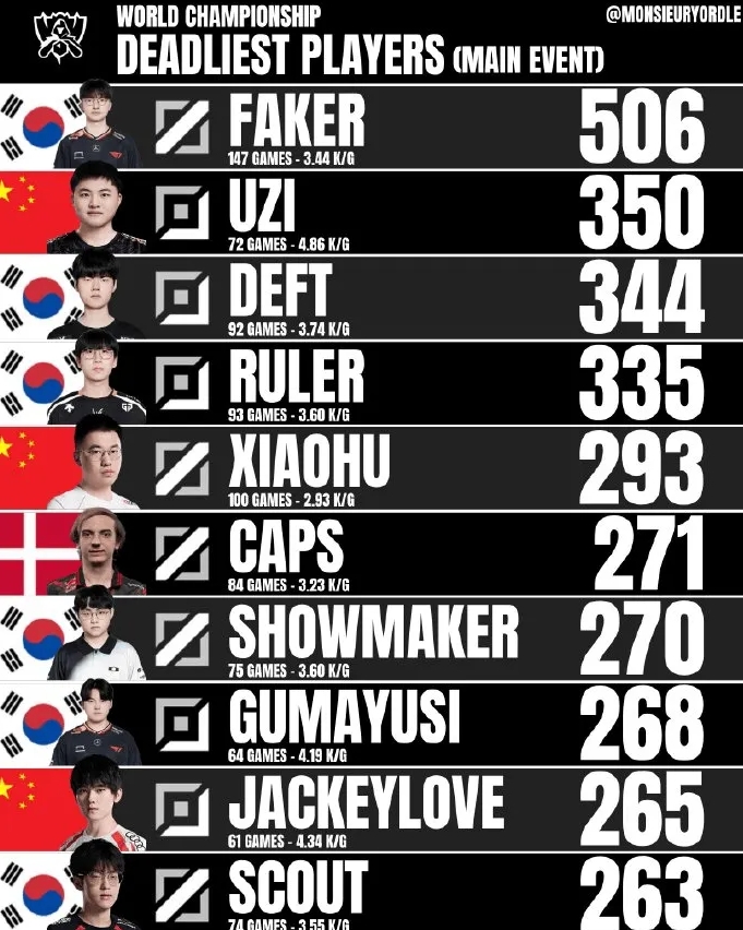 7.Showmaker:75场/270总击杀场均3.60击杀