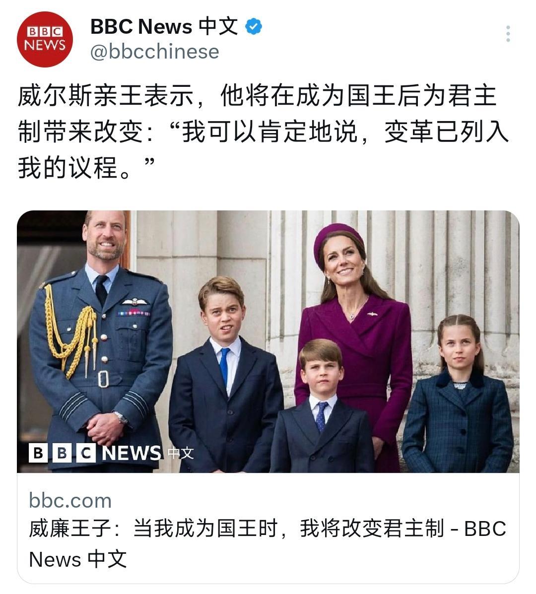 BBC中文网今晚(10月4日晚)写道:“威廉王子:当我成为国王时,我将改变君主制