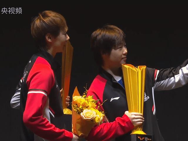 10月4日中国大满贯王曼昱和蒯曼夺得女双冠军圆满完成自己的任务。拍照环节蒯曼被奖