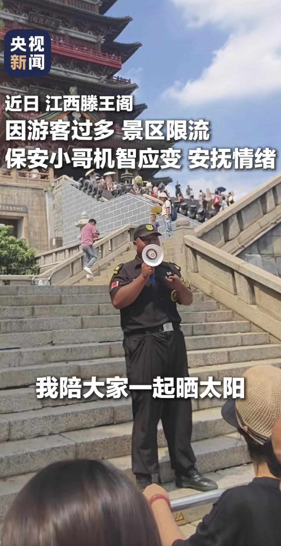 最近在江西的滕王阁景区,游客多得不得了,为了安全只好临时限流。这可把一些大老远来的游客急坏了,情绪不免有些焦躁。 这时,一位保安小哥站了出来,他没有生硬地指挥,反而用一句特别实在的话安慰大家:“我陪大家一起晒太阳!” 这话一出,瞬间拉近了距离。后来他还组织起了问答小游戏,现场气氛一下子就轻松活跃了很多。大家都说,这位小哥的机智和体贴,真是给这趟旅行加了分!