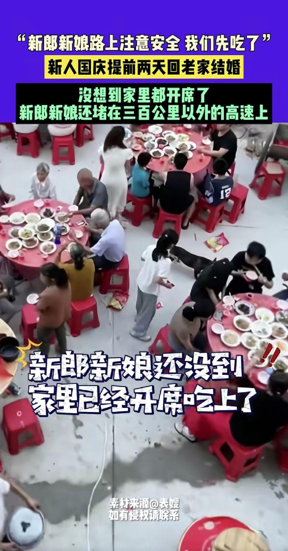 这可真是“人在囧途”的现实版!一对新人国庆提前两天回老家办婚礼,没想到被堵在300公里外的高速上。 更逗的是,家里的亲戚朋友们等不及,直接先开席吃上了!新娘子还没到场,婚宴已经热热闹闹地开始了。 虽然新人没赶上头一口菜,但这份随性和热闹反倒成了最特别的婚礼记忆。毕竟好事不怕晚,团圆的心意到了最重要!