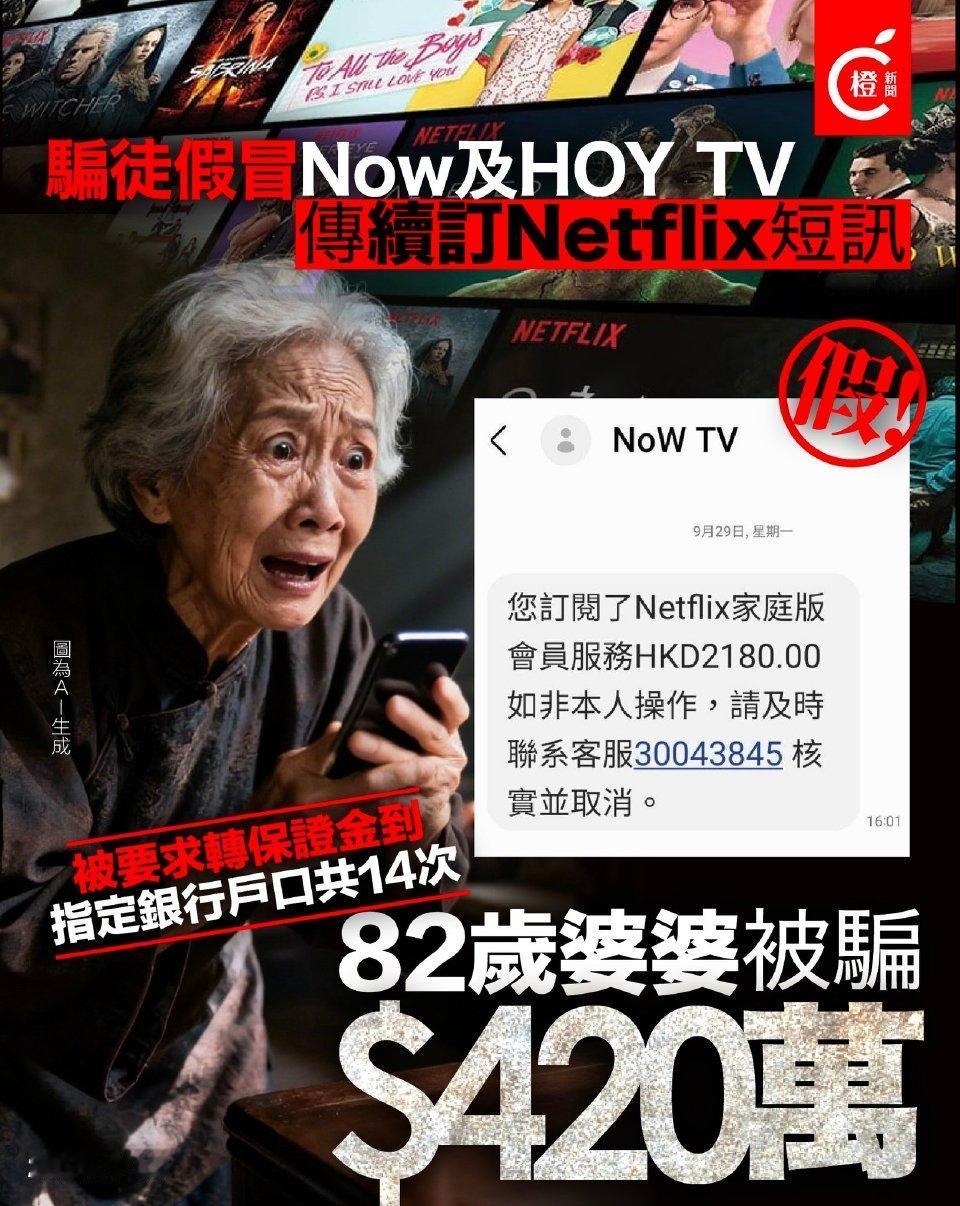 一位居住在屯门黄金海岸小区的82岁婆婆收到一则短信,对方表示登记了有线电视家庭服务计划。 阿婆心急之下,就拨打了这个电话,要澄清自己没订购这个服务,要取消。 一番争论之后,对方要求支付保证金。 就这样,阿婆14次转账,合共超过420万元。 而后发现不对劲,已经来不及了。