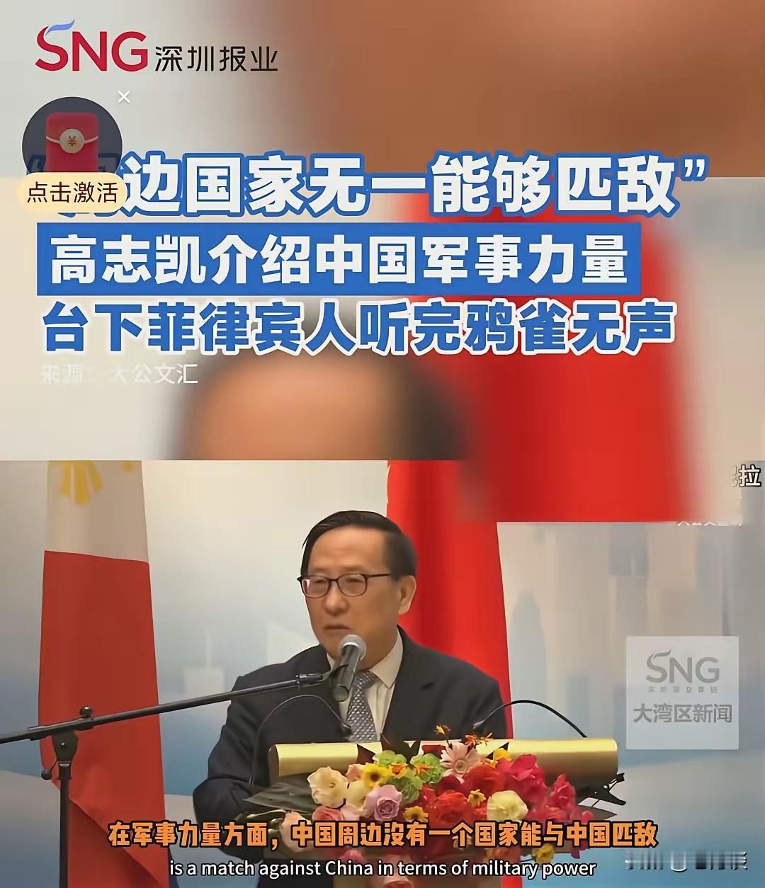 中国著名学者高志凯说,中国周边没有一个国家的军力可以与我们匹敌。高志凯关于我们军力的介绍,让台下菲律宾人听完鸦雀无声、惊愕不已。 其实我们周边很多国家都抱着幻想,他们有实力与我们对抗,同时也以为我们发展军事实力是为了与这些周边国家争地位。其实这都是他们的臆想,他们都是异想天开更是高看了自己。 我们不断的发展自己的军事实力,完全是为了自保,为了实现祖国统一,为了实现民族的富强,为了对抗日益变化的国际形势,也为了应付美国在中国进行的军事部署,中国的军力从来不针对周边国家,更不会对周边国家打起第一枪我们完全是为了维护国家的独立和主权 我们早就已经跳出了区域的限制,我们主要放眼于全球,主要放眼于世界对中国的影响,特别是主要的国家对中国的影响,比如美国、大俄等国家对我们的影响,对于周边的国家,我们秉持友好、扶持、相助的态度。