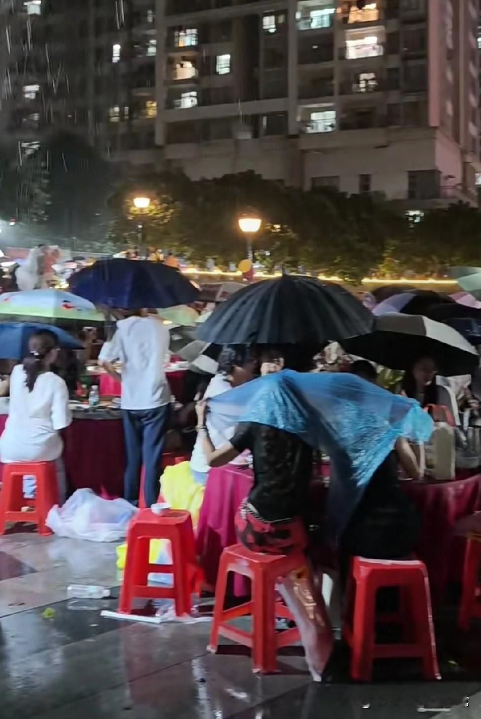 广州猎德土豪得罪龙王了! 广州猎德的土豪们办团圆宴,居然把龙王都“惹毛”了!暴雨倾盆而下,他们却撑着伞、披着雨衣照吃不误,满桌硬菜在雨里飘香,红塑料凳一坐,吃出了江湖儿女的豪情。 有人笑称“这是把‘接地气’玩到了极致”,有人吐槽“有钱人的世界,下雨都要搞排面”。可不是嘛,普通人躲雨时,猎德土豪在雨中吃出了“富贵版大排档”的feel! 你说,要是你有这财力,会选择在暴雨里硬核干饭,还是在星级酒店里优雅就餐?