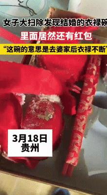 “天降横财?”3月19日贵州,一女子在家中大扫除时,无意中翻出了自己结婚时的衣禄碗,眼见碗似乎有些发白,女子以为是发了霉,就打算拿出来清理一下,放在太阳下晒晒,结果一打开就发现碗里面藏了个红包,里面还有不少“小红鱼”!网友:“赶紧翻翻我的碗里,看有没有红包!” 谁能想到,大扫除时翻出的一只旧碗,竟藏着多年前的“惊喜红包”?3月19日,贵州一位女子的经历在网上引发了不少关注,这事儿还得从贵州婚嫁里的“衣禄碗”说起。 当天,这位女子趁着天气晴好,打算把家里彻底清扫一遍,尤其是平时不怎么翻动的储物角落。整理杂物时,她翻出了一个熟悉的物件——自己结婚时娘家陪嫁的衣禄碗。 这只碗跟着她过了好些年,一直被妥善收在柜子深处,久未打理的碗沿一圈有些发白,摸上去还有点粗糙,她心想怕是长时间没动,受潮长霉了,就赶紧找了块布打算擦干净,再拿到阳台太阳下好好晒晒除菌。 可就在她捧着碗准备擦拭的时候,手指碰到碗底感觉有些异样,倒过来轻轻一磕,一个红色的小信封“啪嗒”掉在了桌上,正是常见的喜庆红包样式,她愣了一下,拆开红包一看,里面整整齐齐叠着不少百元纸币,也就是大家常说的“小红鱼”。 看着这突如其来的“财富”,女子才猛然想起,这应该是当年结婚时家里长辈悄悄藏在碗里的,只是日子一久,连自己都忘了这回事。 在贵州的婚嫁风俗里,衣禄碗可是陪嫁清单里的重要物件,和喜盆、梳子这些一样,是女方家对新人的美好祝愿。 像贵阳地区,女方出嫁时带上衣禄碗,寓意着往后小家庭衣食无忧、生活富足,这和有些地方婚俗里“偷碗”求兴旺的说法有着相似的美好期盼。 这只碗承载的不仅是餐具的功能,更是老辈人通过民俗传递的祝福,而藏在碗里的红包,就成了这份祝福最实在的寄托。 这件事被分享到网上后,很快引来了网友们的热议: 有网友立马留言:“赶紧翻翻我的碗里,看有没有红包!” 还有网友感慨道:“这哪是红包啊,是老辈给的‘衣食无忧符’吧!我家的陪嫁箱得赶紧翻一翻。” 大家的讨论里,满是对这份意外惊喜的羡慕,也藏着对传统民俗的好奇。 这件事让我们明白了,那些被妥善收好的婚嫁老物件,从来都不只是摆设,它们背后藏着地方的民俗文化,也装着长辈们说不出口的牵挂,说不定哪天翻出来,就能发现藏在其中的温暖心意,这些都是值得被好好珍藏的文化记忆。 那么你们怎么看待这件事呢?欢迎在评论区说说你们的看法吧!