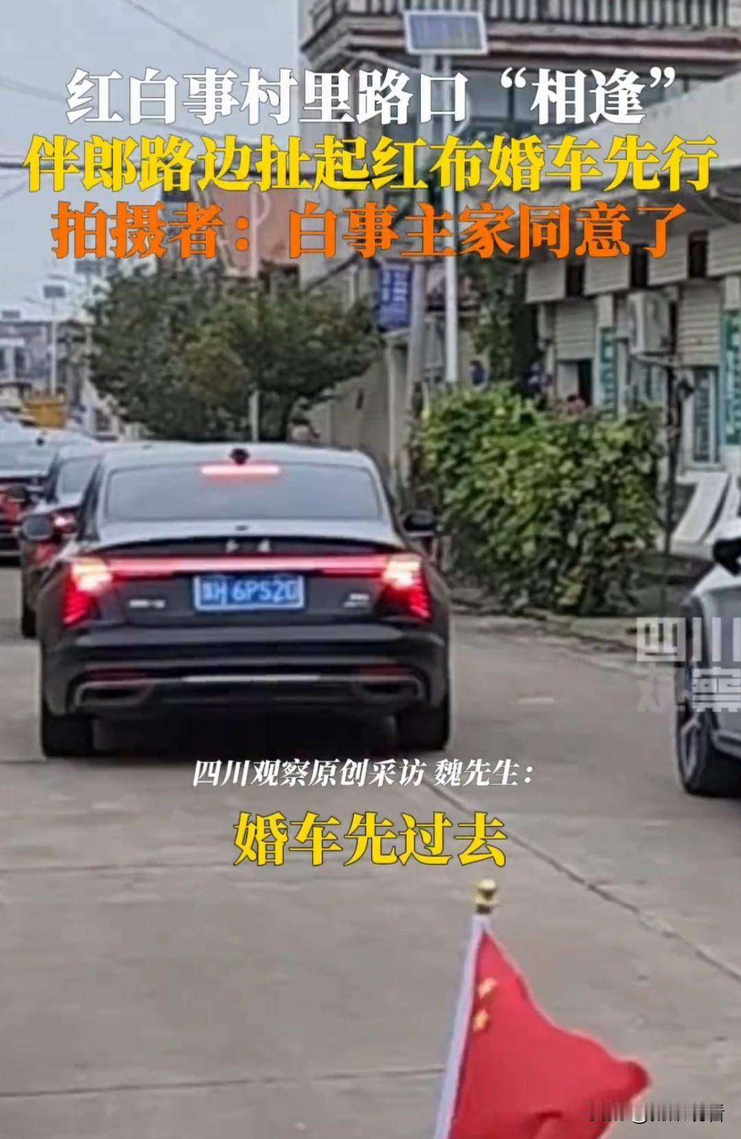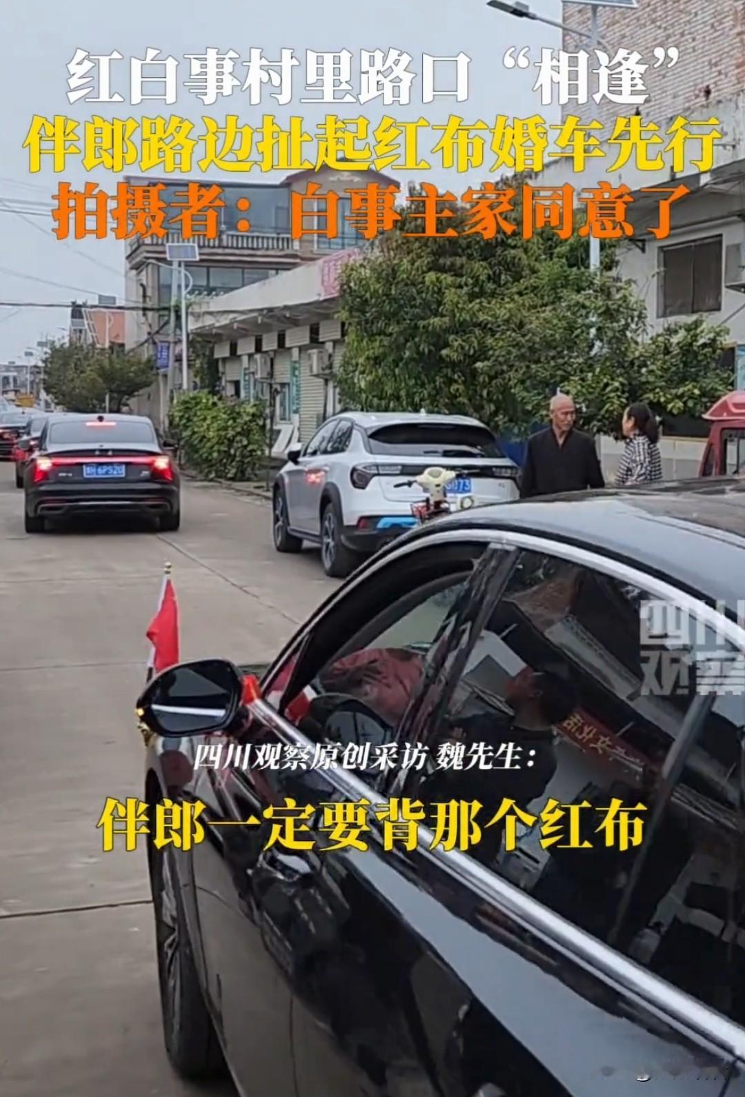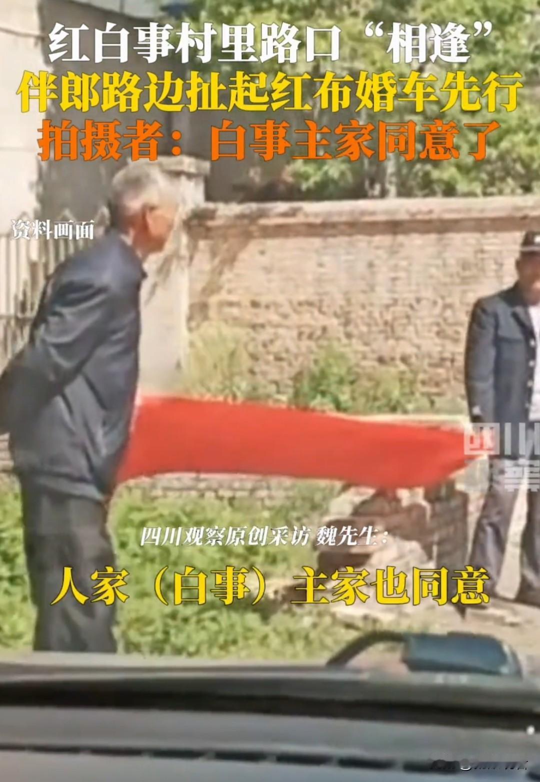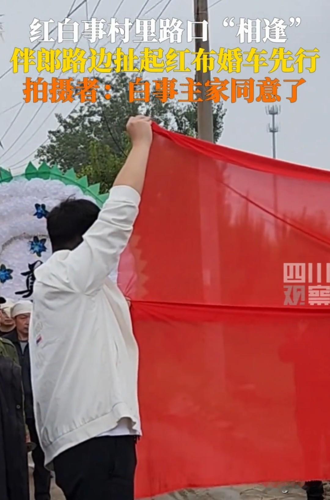 近日,河南焦作发生了一起红白事在路口相逢的事件,伴郎路边扯起红布婚车先行,拍摄者:白事主家同意了。 据说这是当地的习俗,具体的化解方式是两边用一面红布隔断,伴郎要背对着红布挡一下,隔断后,婚车先行通过。 因为有说法认为,这种做法源于传统习俗中“白让红”的讲究,民间认为红事象征新生希望,白事代表离别终结,白事让红事是对喜事的成全,也体现对逝者的尊重。红布相隔则是为化解心理避讳,避免氛围冲突,是约定俗成的缓冲方式。
