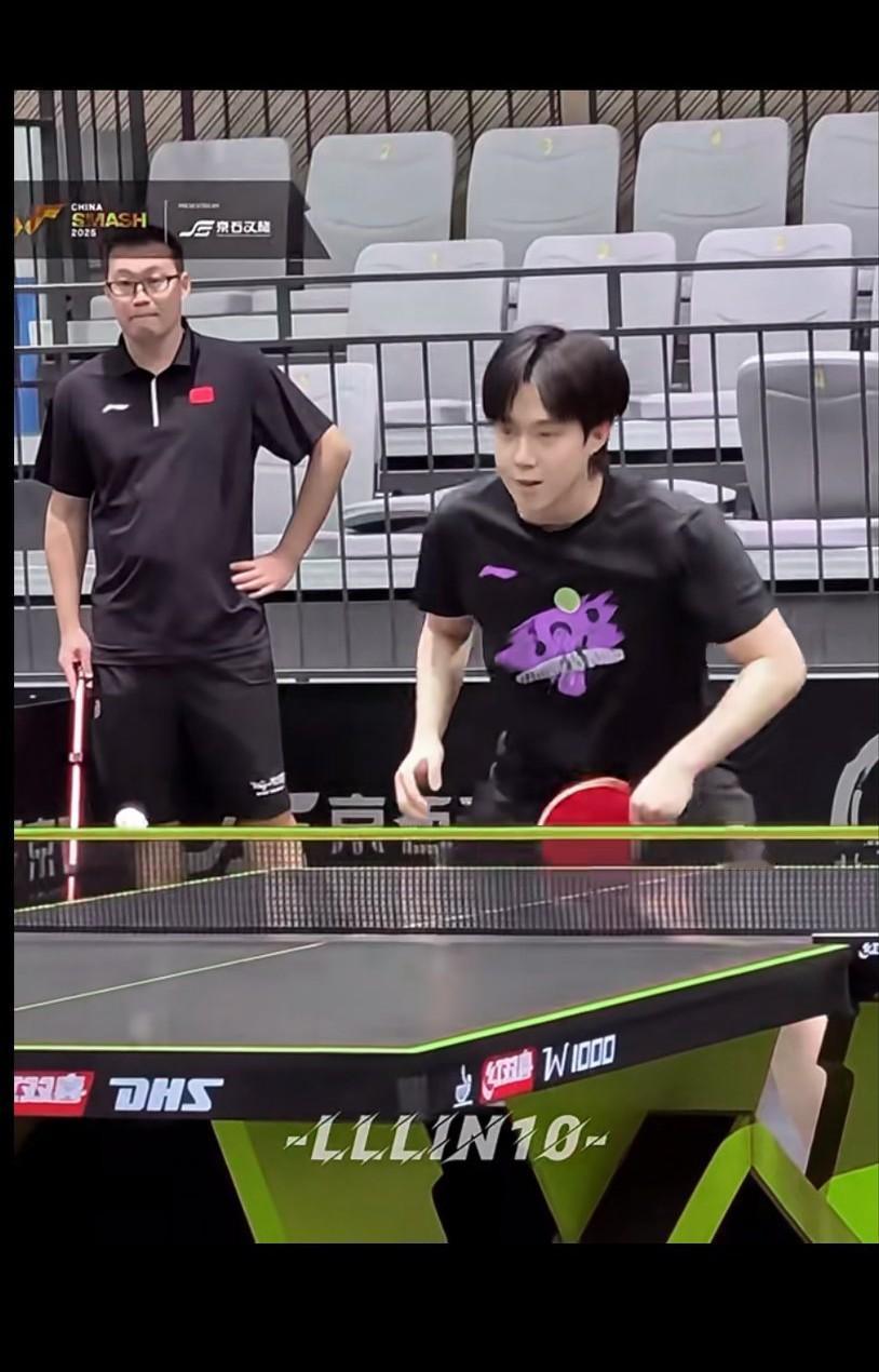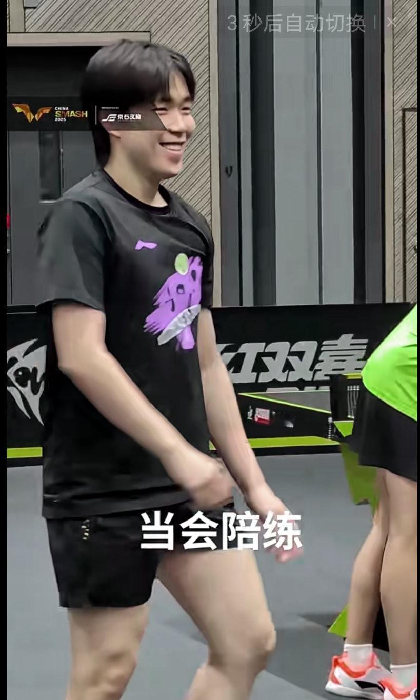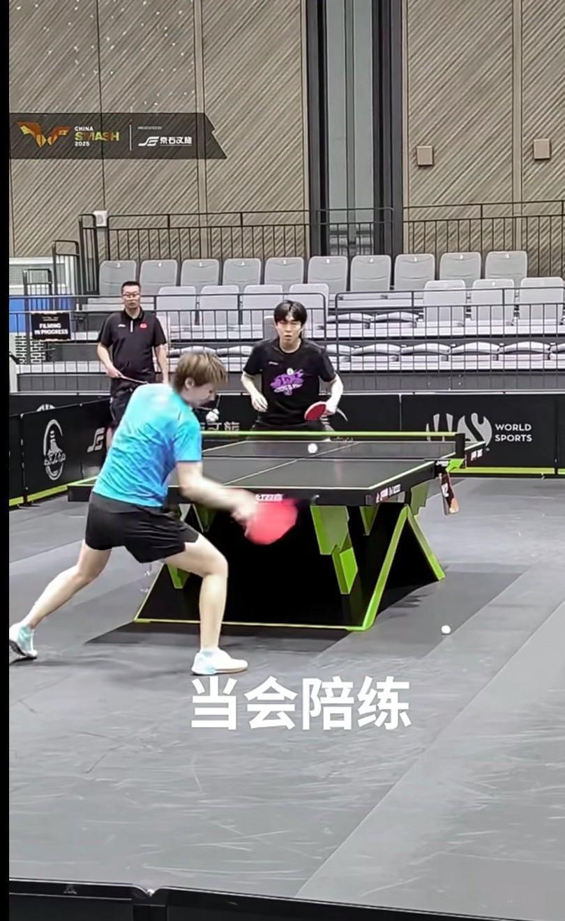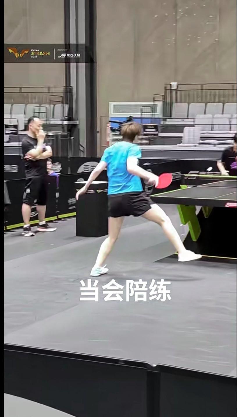 鳗鱼,前几天有一场打印度的巴库拉,印度这个是颗粒特殊打法,头头就用颗粒拍子模仿巴库拉陪练鳗鱼!王曼玉和大头一起训练、孙奇体能教练在旁边给她们捡球。