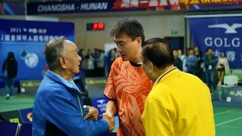中国羽毛球教父王文教,与昔日弟子赵剑华亲切握手交流。王老为中国的羽毛球运动发展与