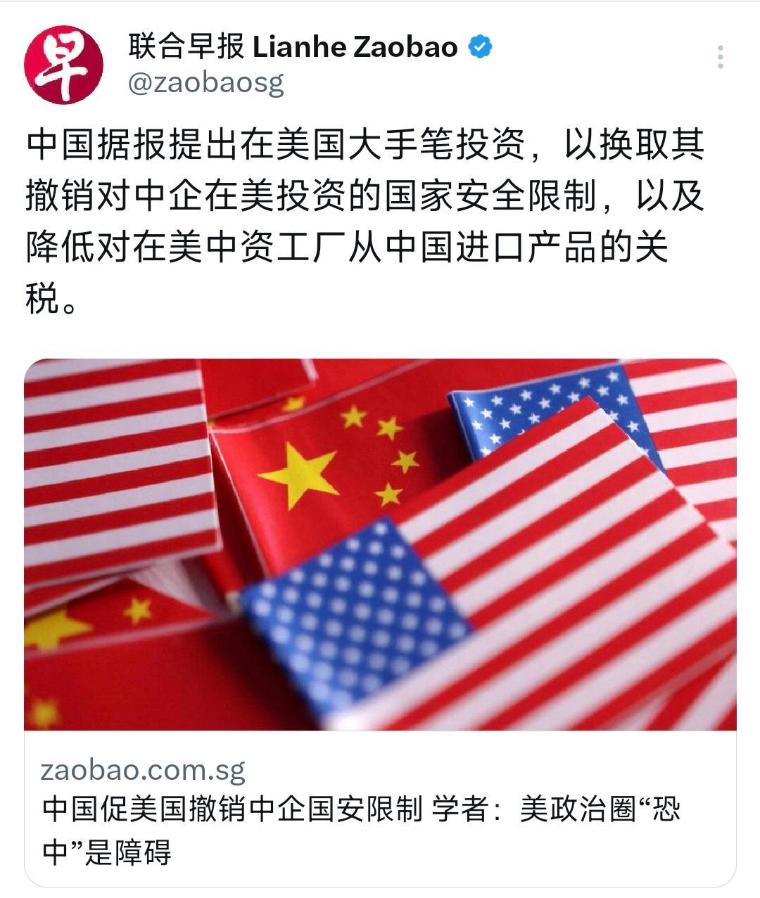 新加坡联合早报今天(10月5日)写道:“中国据报提出在美国大手笔投资,以换取其撤