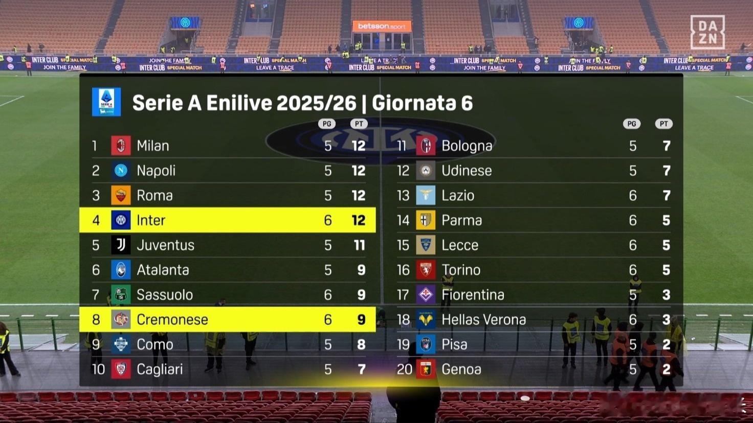 国际米兰先赛取胜升至第4,积分暂时追平身前3支球队。