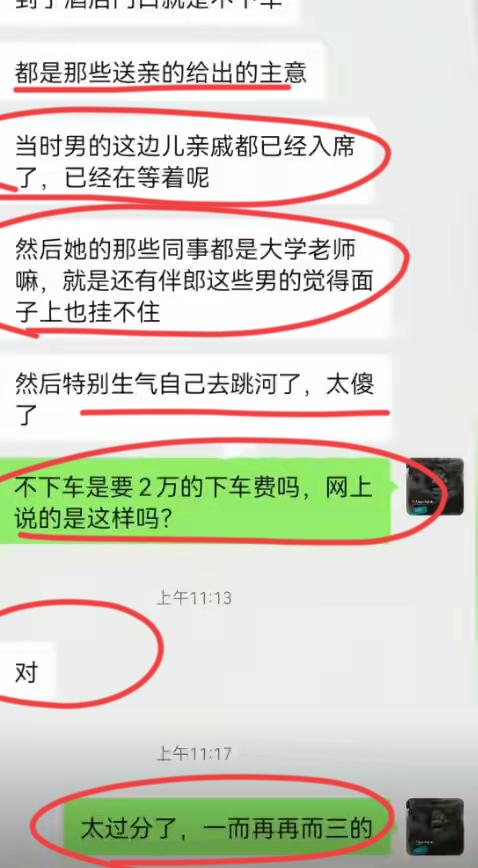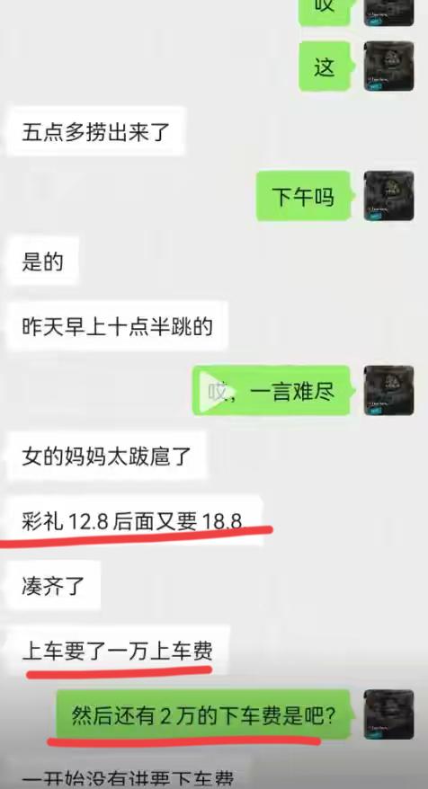 双节期间的悲剧!! 婚宴开始前一小时,新郎官跳河自尽了。 我的个老天呢,到底发生了什么? 我看了一下新闻报道和网友的爆料; 女方太过分了,男方砸锅卖铁凑了18.8万彩礼,还不够么? 上车费还要一万,也想尽办法给了; 下车临时又要2万,可能真是拿不出来了; 新郎官情绪彻底崩溃了,从婚宴酒店跑出来; 一头从桥下扎了下去,消失在茫茫的水面; 不得不说,彩礼真是陋习,动不动要20多万; 加上买房,买车,一般年轻人还真的扛不住; 这新郎官也是傻,这女的,娶来何用,还搭上一条命; 你是走了,那女的还可以马上再嫁,不受任何影响,你父母咋办? 不但彩礼是陋习,那些红白喜事,大操大办的都是陋习; 有的地方不但结婚要大肆花钱,老人去世,土葬,更是折腾到无以复加; 比结婚花的钱还多,折腾的眼花缭乱。 连续操办几天,甚至10天,请全村人吃席,停放10天8天,再抬出去土葬; 花费十几二十万,一大堆人整天跪着,还要通宵达旦,烧香化纸,锣鼓喧天,鞭爆齐鸣,把没死的人,差点都要整死。 这不是陋习是什么,应该全部废除! 有特别是巨额彩礼和这白喜事大操大办的土葬,应该全部立法废除!!