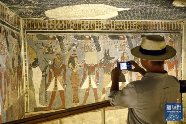 ↑10月4日,游客在埃及卢克索帝王谷的阿蒙霍特普三世法老墓内拍照。