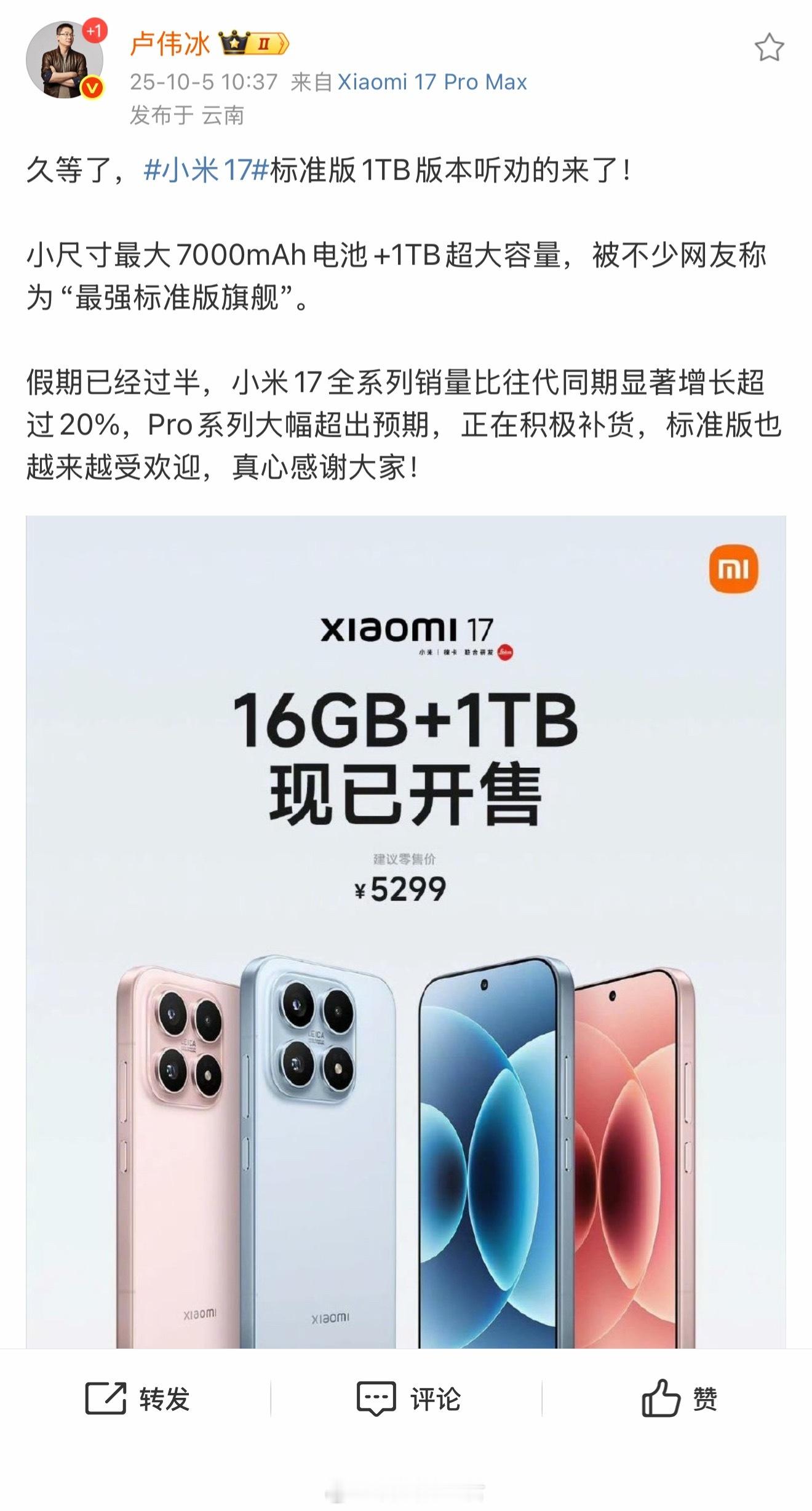小米17开售1TB版朋友们小米17 16+1TB版本也来了,售价5299元,9月27日正式开卖,话说小米17系列总销量已破百万,卖的太好了~