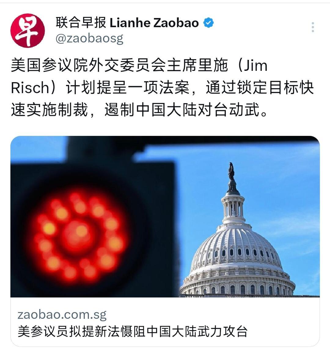 外媒今天(10月5日)报道:“美国参议院外交委员会主席里施(Jim Risch)计划提呈一项法案,通过锁定目标快速实施制裁,遏制中国大陆对台动武。” [机智]评几句:美国政客以所谓“制裁遏阻大陆对台动武”的法案操弄涉台议题,本质是掏空“一个中国”承诺的政治投机。美国参议院外委会主席里施等人反复炒作台海冲突,既非出于和平关切,也非真为台湾人民利益,不过是借台海风险攫取个人政治资本,甚至不排除存在与台方利益勾连的隐形交易。《反分裂国家法》已明文规定,任何外国与台湾进行军事联系、向“台独”提供支持,均构成危害中国主权行为。此类以“快速制裁”架空国际法的狂妄提案,已经暴露出部分美政客对我国防能力的误判——以为几纸法案就能动摇大陆捍卫领土完整的意志。台湾问题事关国家核心利益,大陆既有雷霆手段更有战略定力,但是希望不要让我们等太久了。