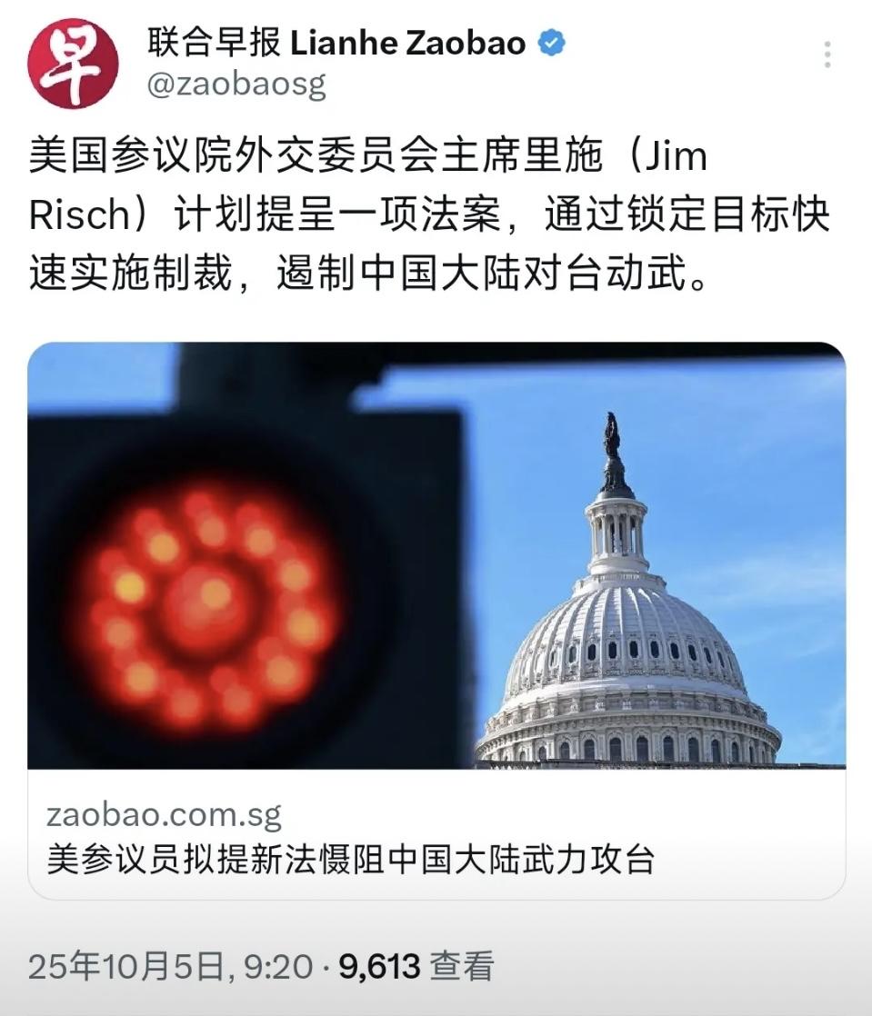 美国政客又拿台湾当“提款机”了?里施搞的“快速制裁法案”,根本不是为了和平,就是场赤裸裸的政治投机。 这人可不是第一次干这种事,之前提“台湾吓阻法案”,表面给军事融资,实则逼着台湾买美国军火,帮军工企业赚钱。 现在换个花样搞制裁提案,本质还是老一套:借台海议题刷存在感,捞取政治资本,顺便把台湾绑上美国的战车。 真当大陆的《反分裂国家法》是摆设?台湾是中国内政,轮不到外人指手画脚。里施怕是忘了,中国这些年早就把反制的后手备足了,金融、贸易哪块没留招?几纸法案就想动摇我们捍卫主权的决心,简直是异想天开。 这种“以台制华”的老把戏,你觉得还能骗得了谁?