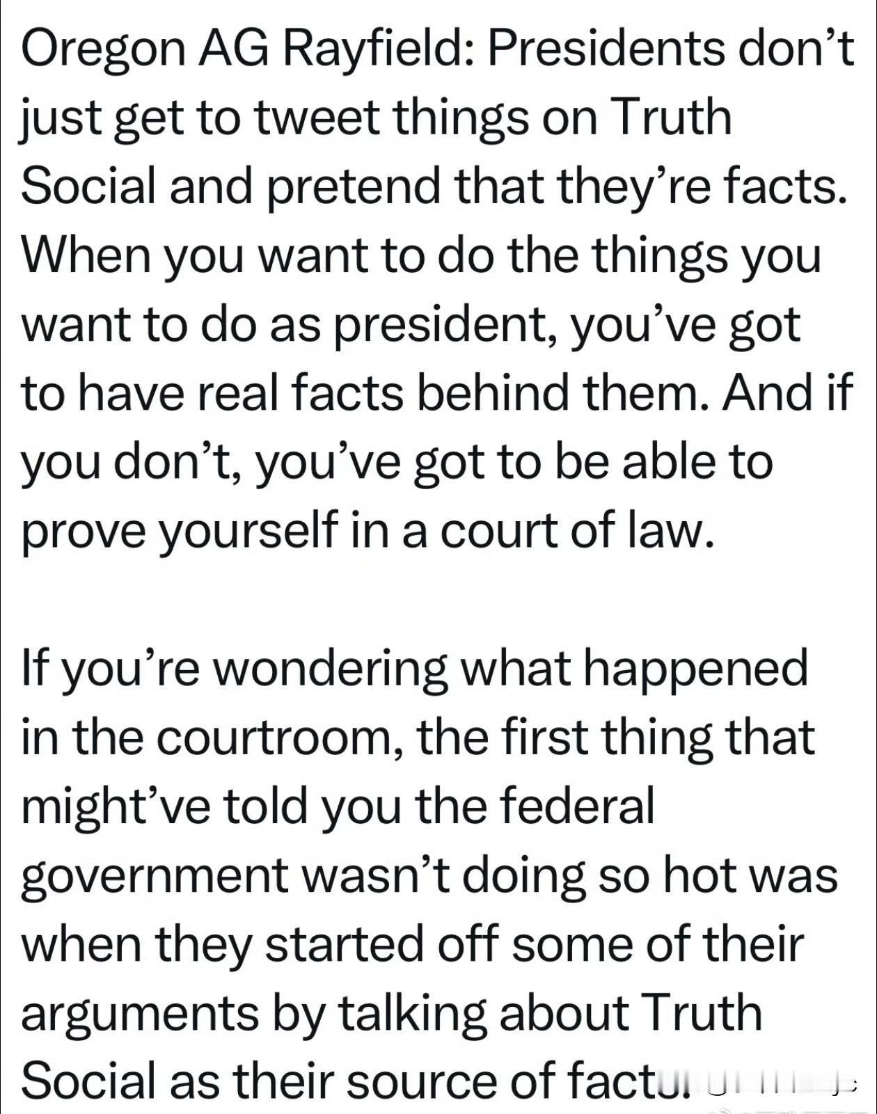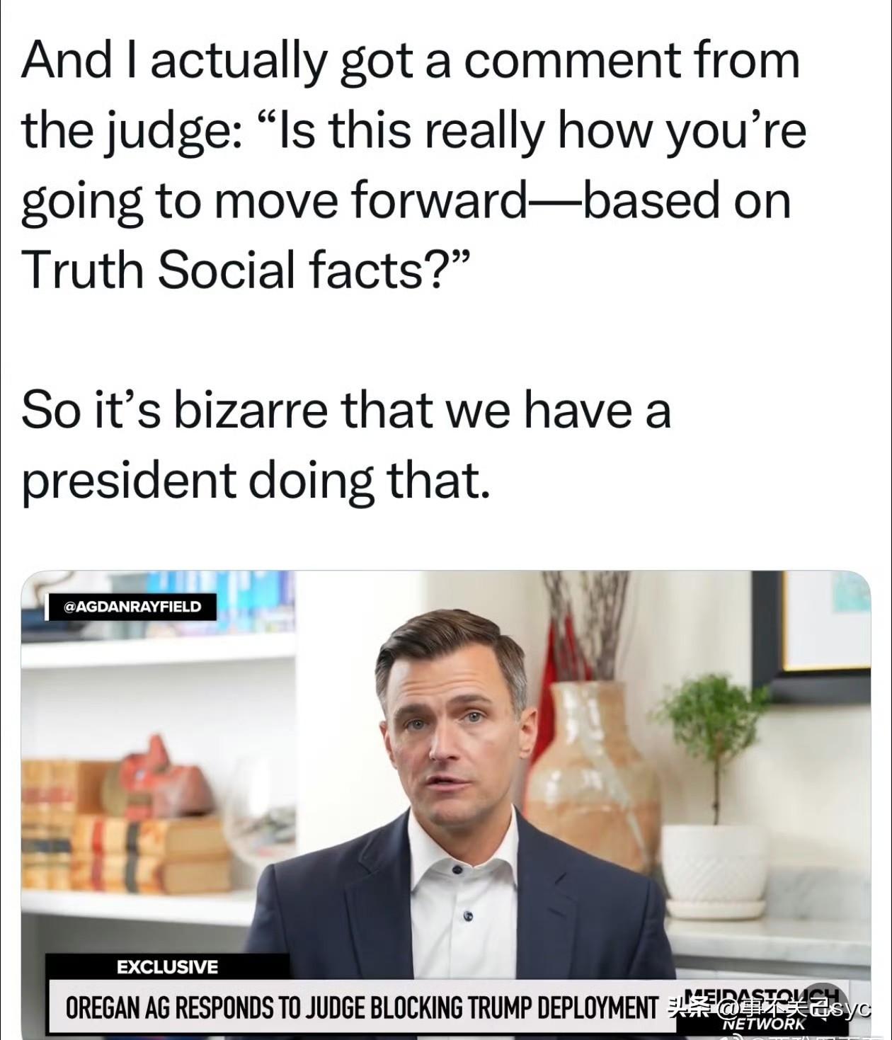 美国联邦地区法官判:波特兰没有紧急状态,总统调俄勒冈国民卫队是越权,违反宪法第十修正案。 当地时间10月4日,美国联邦法官卡琳·伊默古特(Karin Immergut)裁定,暂时禁止总统特朗普在诉讼审理期间向俄勒冈州波特兰市部署200名国民警卫队士兵。 据了解这名法官是Trump本人2019年任命的。 总统向俄勒冈派遣国民警卫队,也遭到俄勒冈州总检察长抵制:总统不能在社媒上随意发言,然后假装他说的就是事实…联邦政府的律师今天在法庭上,一开口就注定会输,因为他们引用总统的社媒言论作为事实…法官质问:“你们真的打算这么辩?用社媒上的话?” 法官的判决书写道:总统派军的决定,忽略真实情况…完全不符合事实。 总统在社媒上的言论不被采纳,不作为法庭裁决的事实。这样的判决在特朗普新任期以来还是第一次。这对于规范总统的言论十分必要。