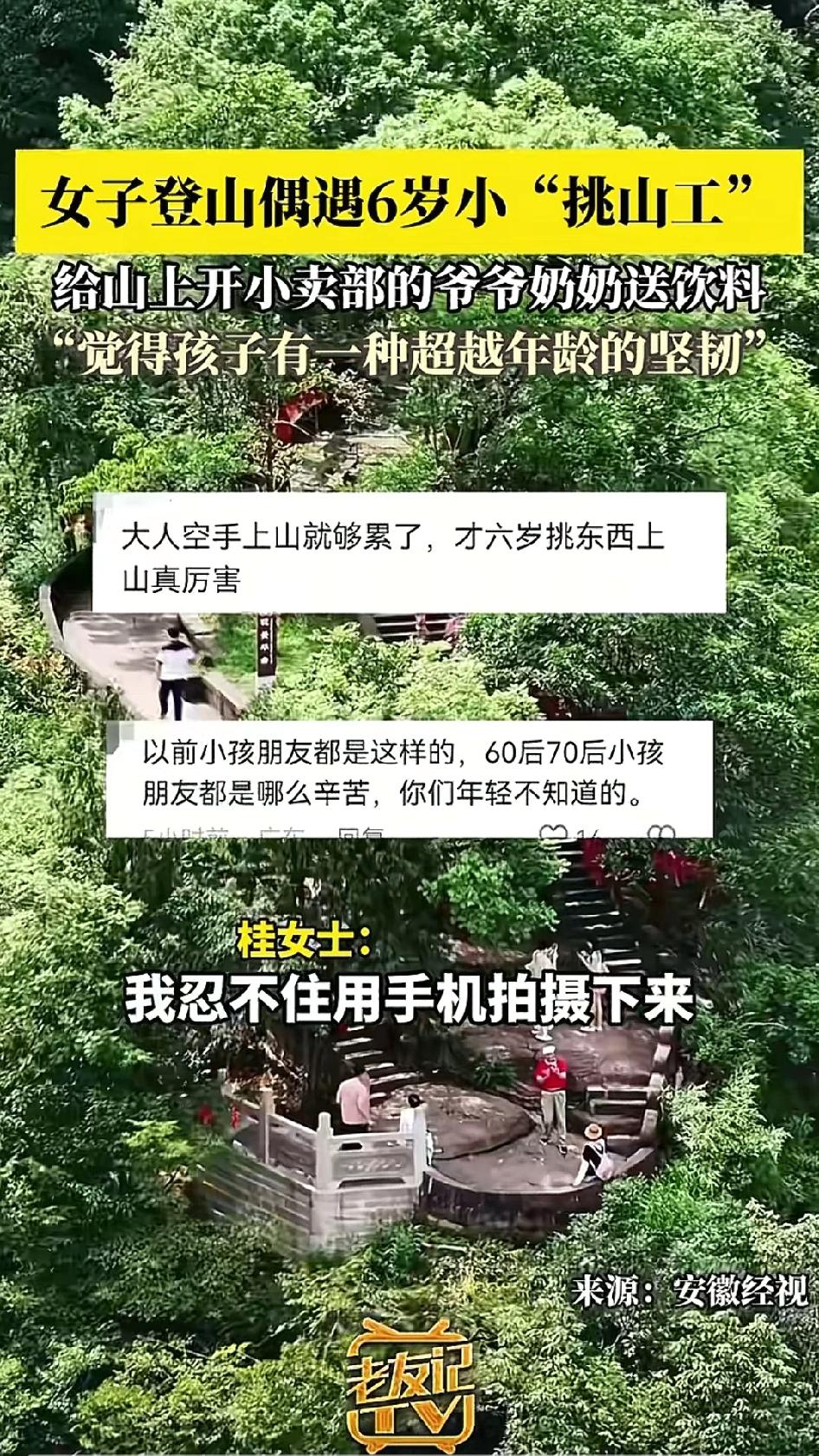 还在上幼儿园的6岁小孩哥做起了“挑山工”!!女子国庆假期爬山,偶遇一小孩哥肩挑饮料上山,把饮料送往半山腰爷爷奶奶开的小卖部,小卖铺卖一些饮料、矿泉水和小吃,女子询问两个老人家得知,小孩哥才6岁,正上幼儿园,一到暑假就在山上捡瓶子,已经捡了几万个了,合计差不多500多斤。大人爬山,空手都够累,一个6岁的小孩只会更累,正如网友所说,这个孩子身上有一股“超越年龄的韧劲”。我想说,人一旦骨子里有了一股韧劲,无论年龄大小,就不会容易颓废,什么困难,都打不倒他。现在的孩子,多半被宠坏,怕这怕那,什么都不让做,吃不得一点苦,迟早会出问题的。