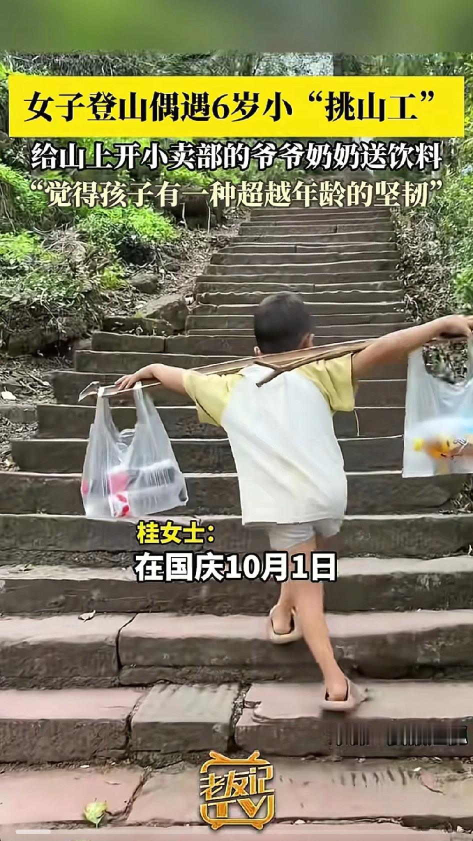 还在上幼儿园的6岁小孩哥做起了“挑山工”!!女子国庆假期爬山,偶遇一小孩哥肩挑饮