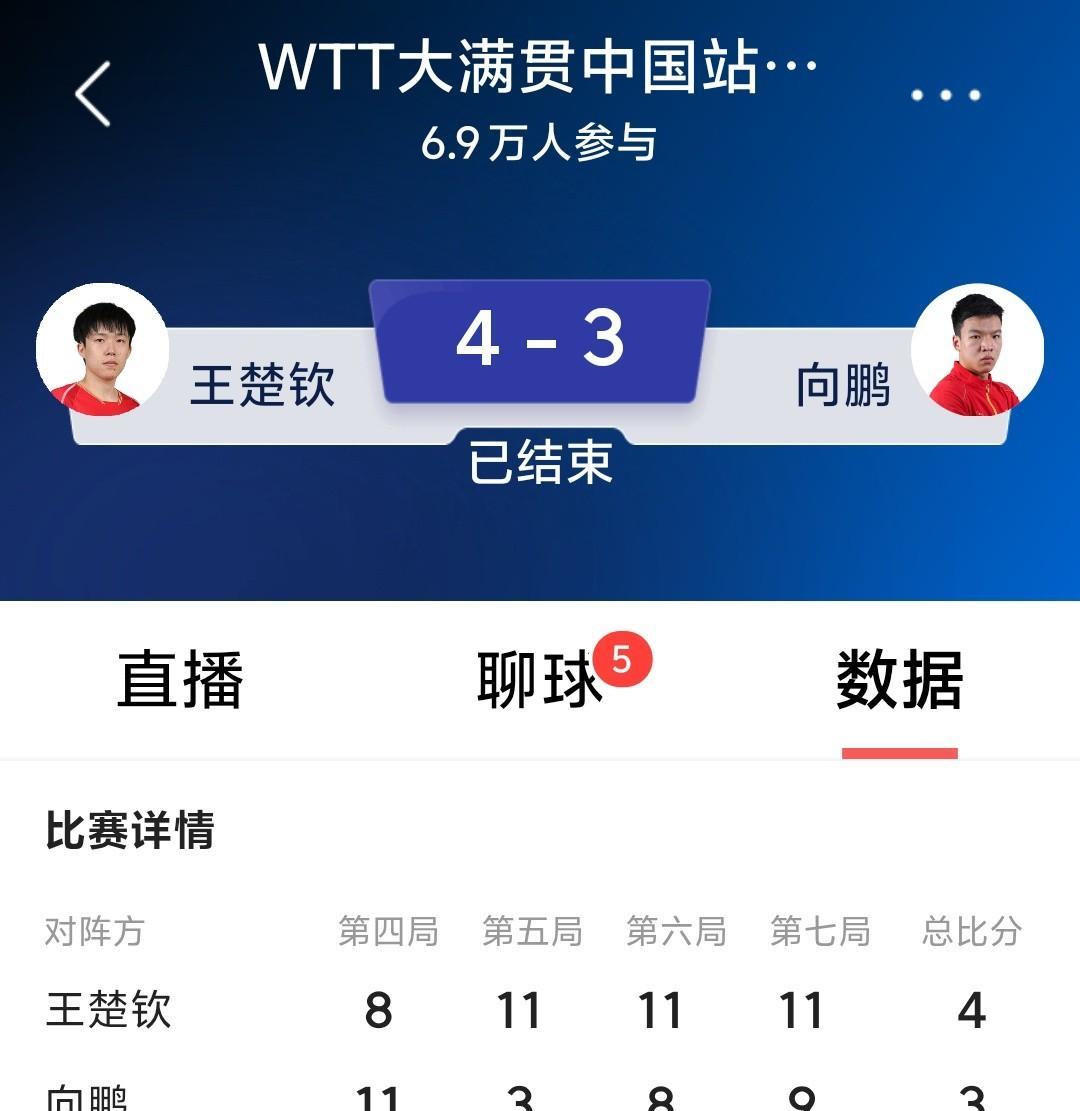 向鹏进步神速,刚刚在wTT中国大满贯男单半决赛中同世界对号选手王楚钦直接打到第七局,双方一上来就较着劲,向鹏连得4分,由小分4:1直到6:2,领先,老道的王楚钦迅速调整,一波连追,双方直打到8:8#国球乒乓王楚钦# 向朋鹏还是没有挺住,最终王楚饮11:9拿下决胜盘,挺进wTT中国大满员男单决赛,向鹏还需再提高自己球技及亚临场定力。