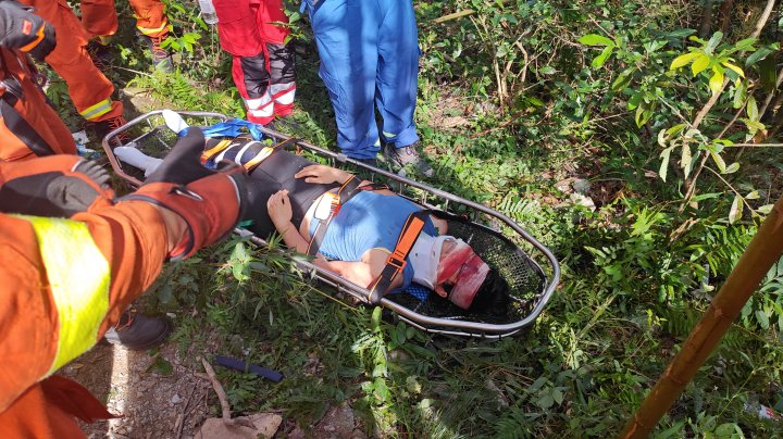 仅用5分钟,消防员就在山脚下发现了受伤女子。她身穿蓝色上衣、黑色裤子,躺在地上,眼部有血迹,已经过同伴简单包扎。据现场了解,该女子除了眼部受伤,身体还有多处擦伤,意识清楚,但手脚发麻无法动弹。