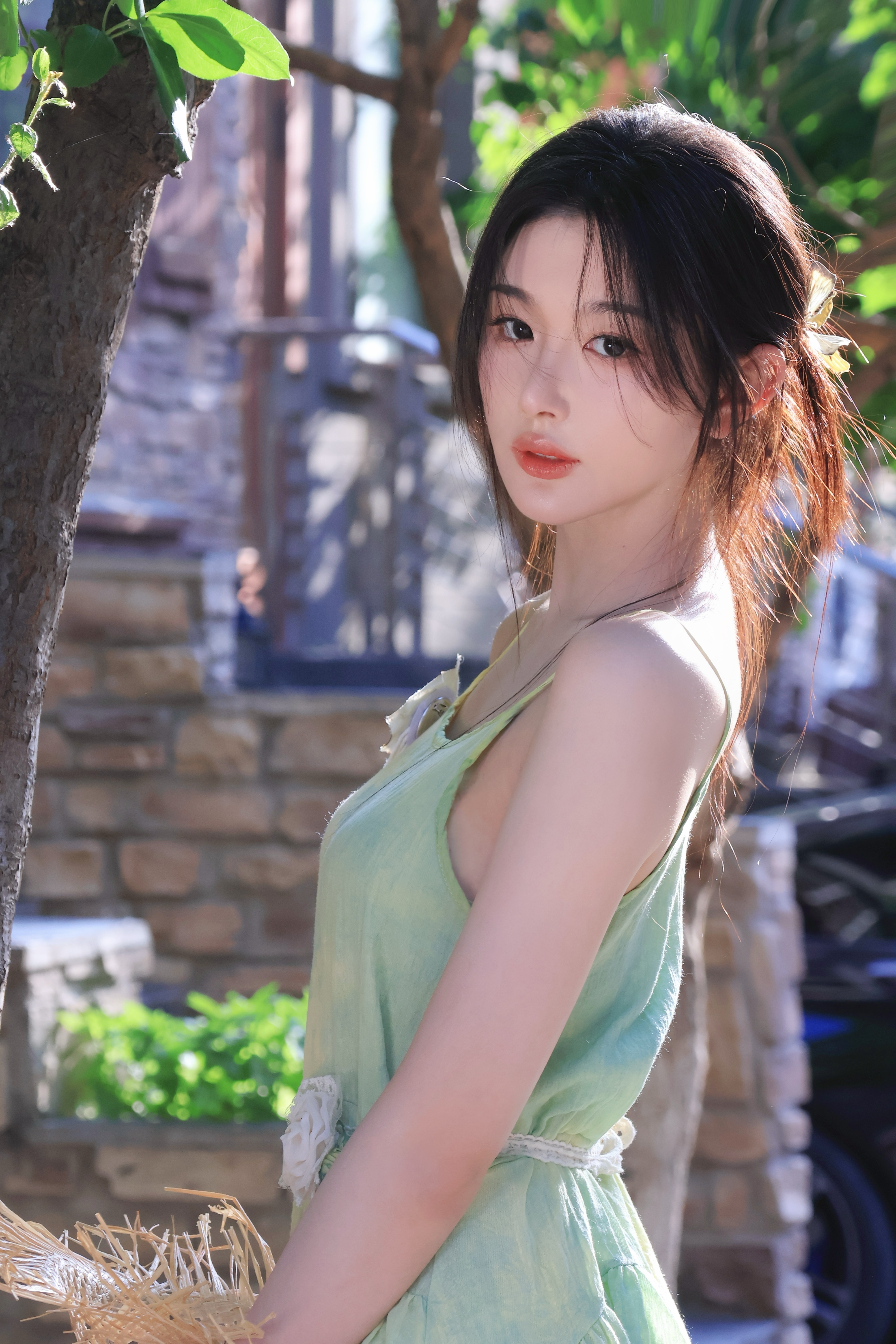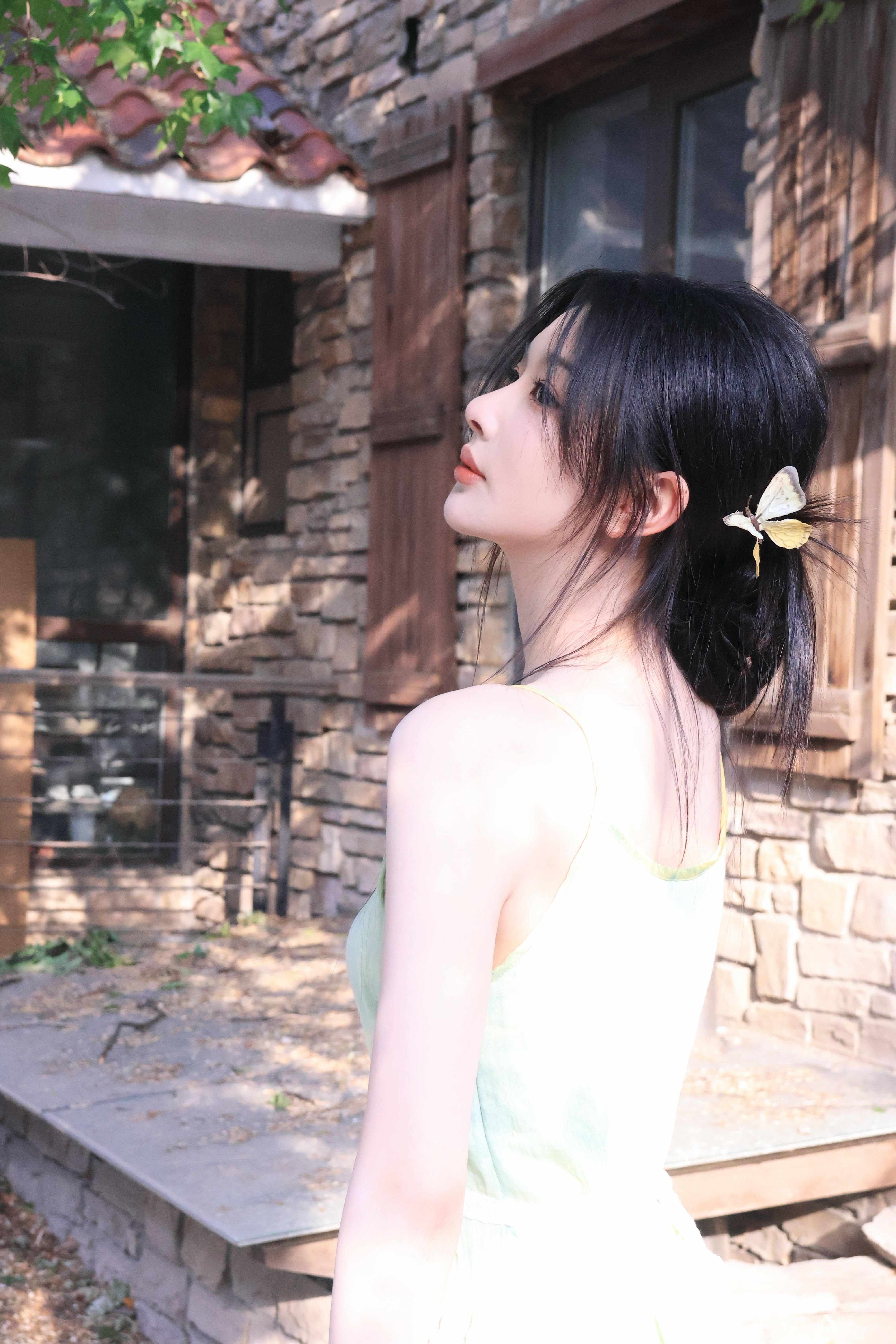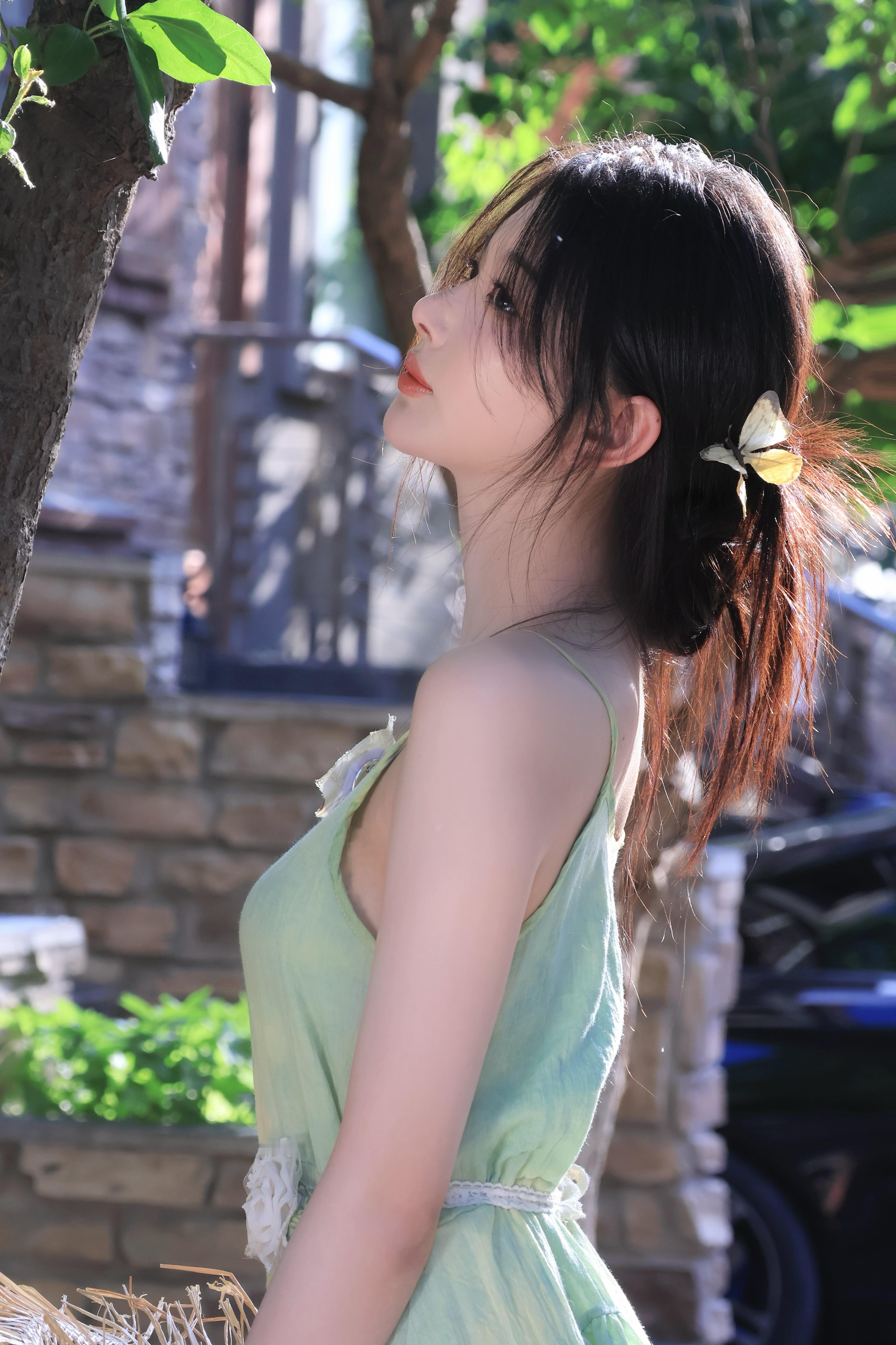 孔雪儿绿色吊带裙:听夏末蝉鸣,观秋初叶落​​​