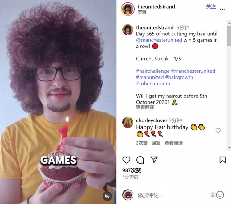 蓄发哥社媒晒出纪念蓄发一周年视频,配文:“不剪头发直到曼联5连胜,已过去365天,当前连胜状态——1/5。”
