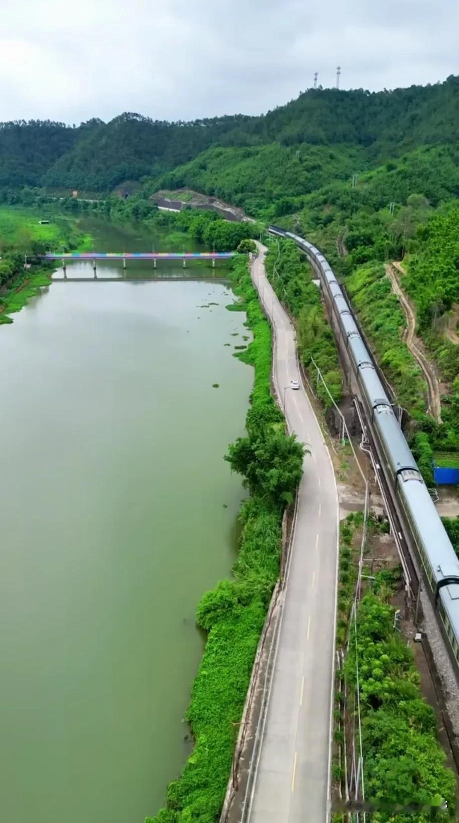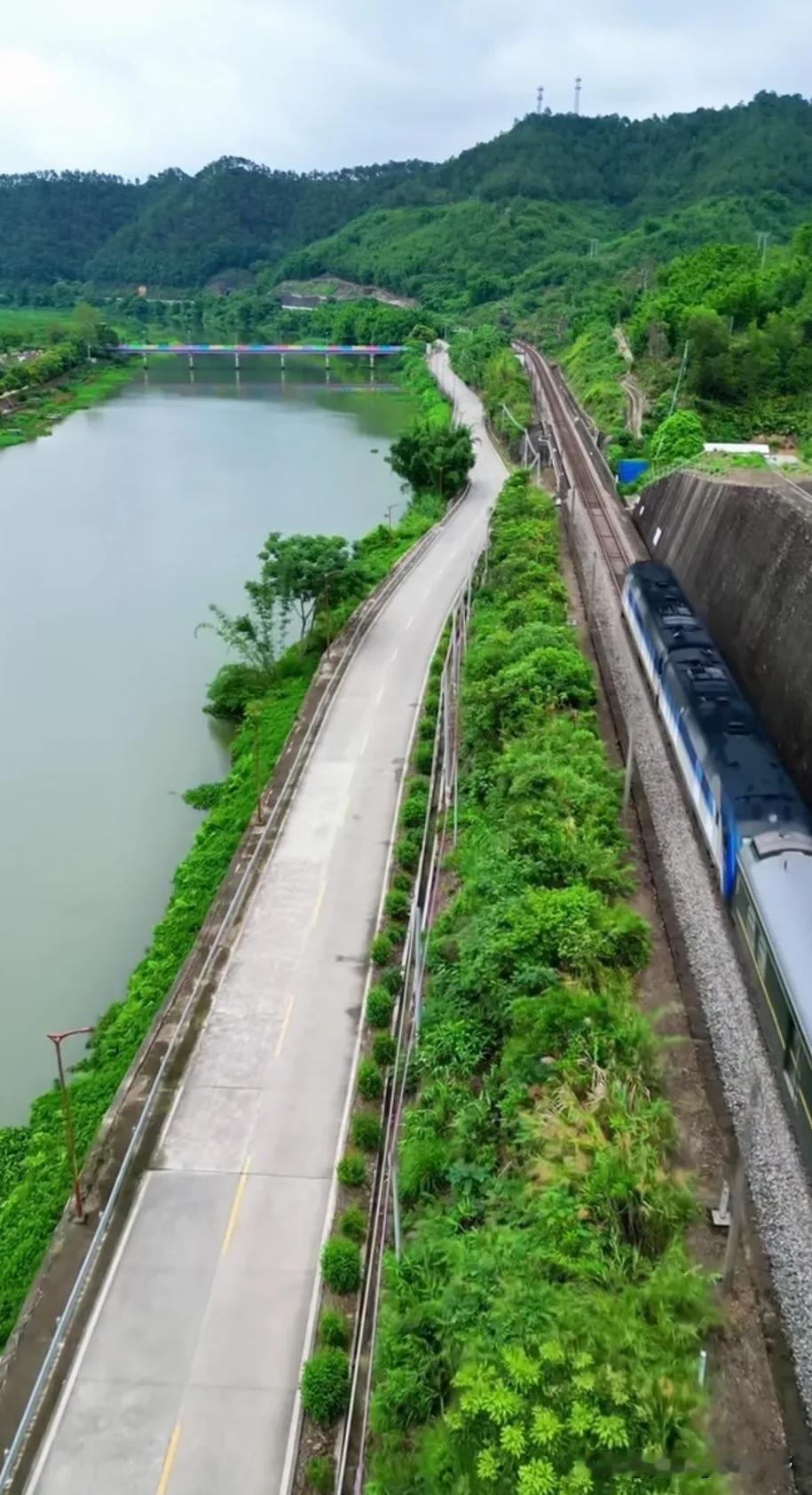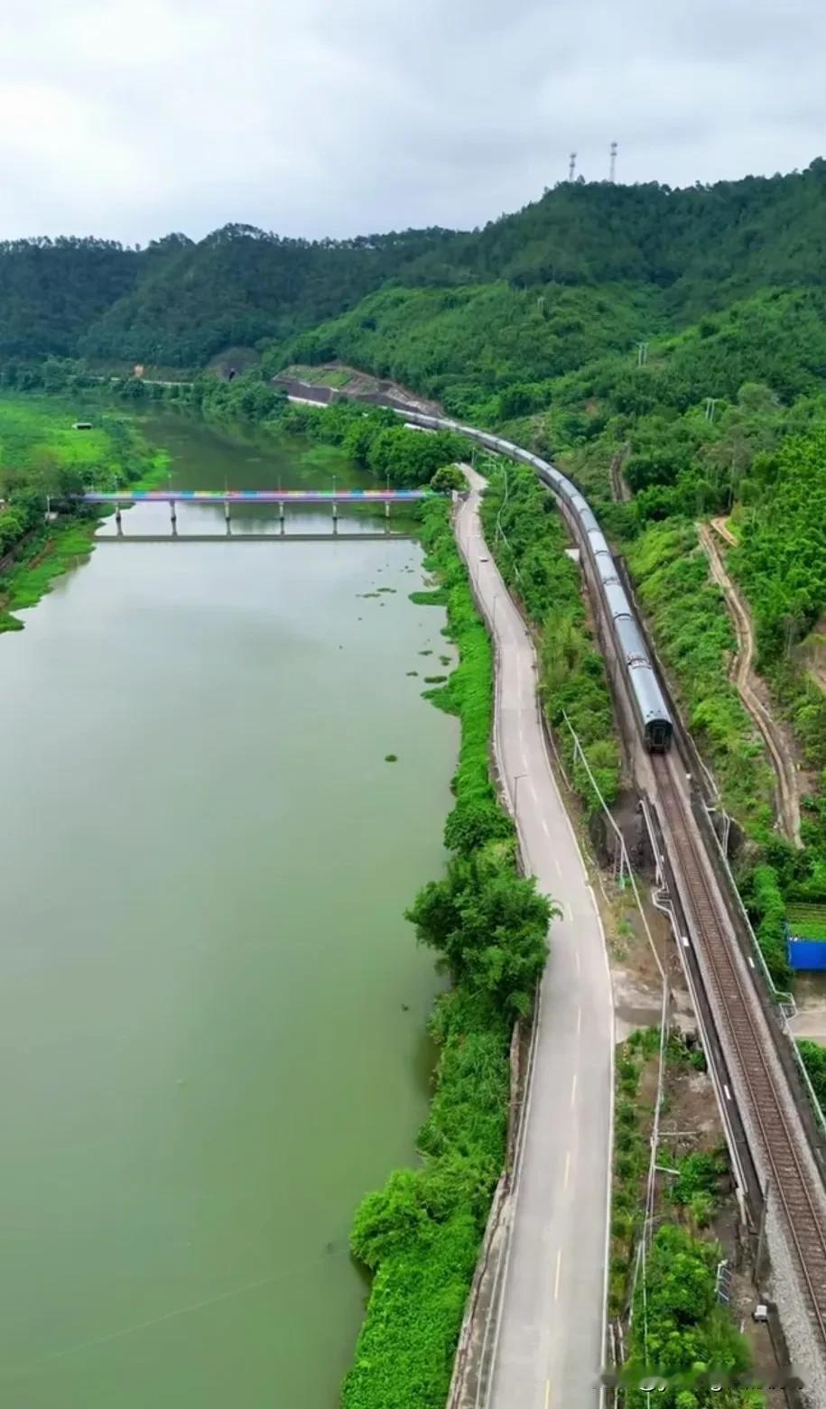 东风11G内燃机车牵引直特列车行驶在广茂铁路上。广茂铁路是广东西部地区的一条单线非电气化铁路,沿线行驶的火车全是使用内燃机车牵引。其中在云浮新兴县路段,广茂铁路和新兴江并行,在周围的群山中穿行。一条江,一条铁路,一列火车蜿蜒在周围的群山当中。这一幕场景也构成了一幅美丽的画卷。