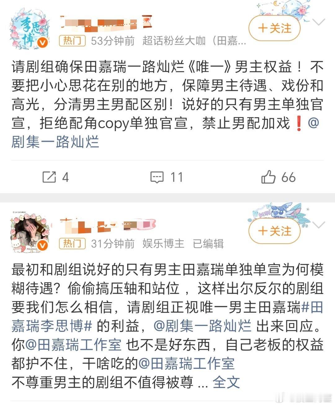 一路灿烂官宣出现了番位争议,田嘉瑞和姚琛都是单独官宣的,目前粉丝在维权番位。