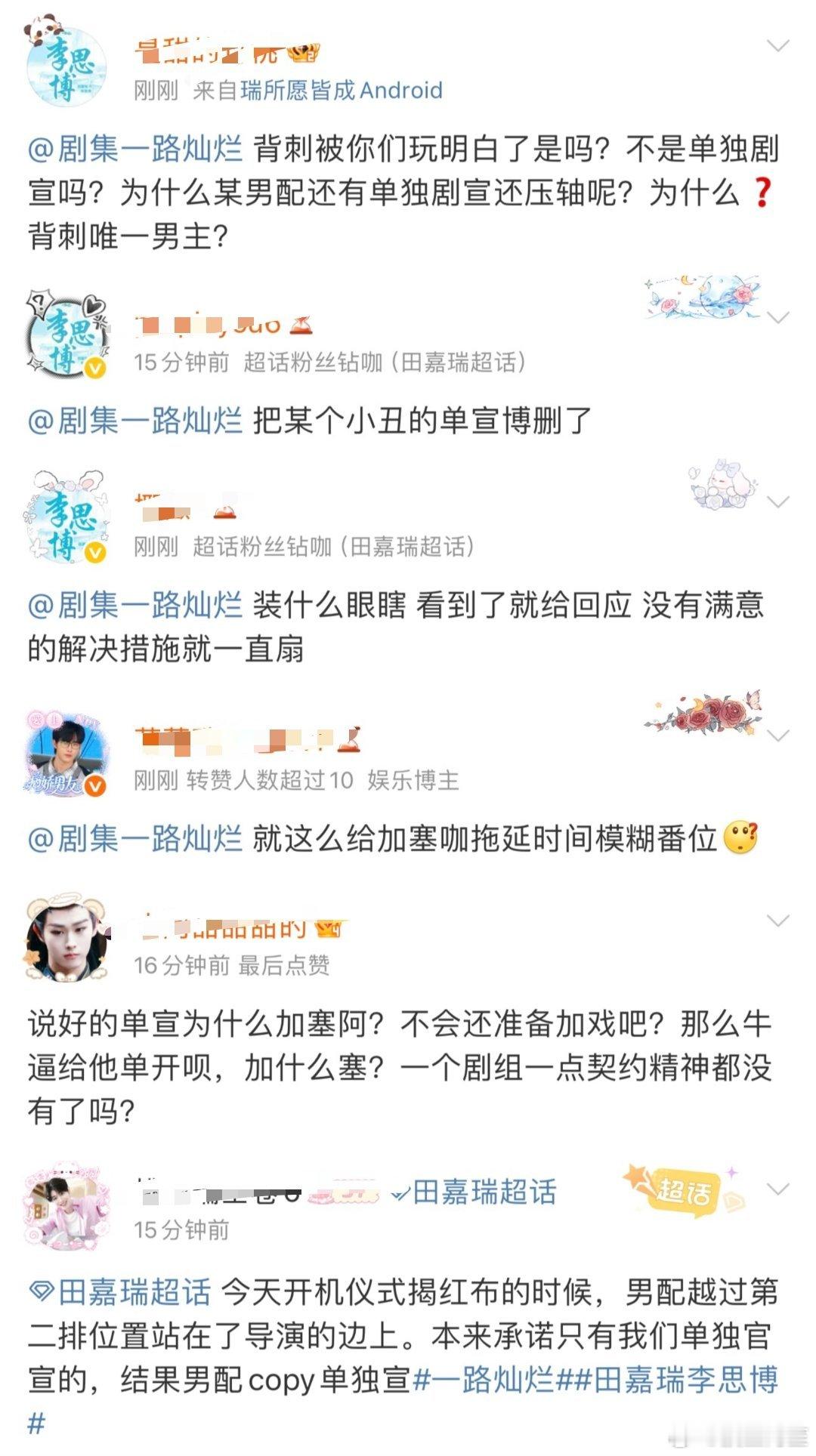 田嘉瑞粉丝正在图一路灿烂广场,要求删除姚琛的单独官宣……