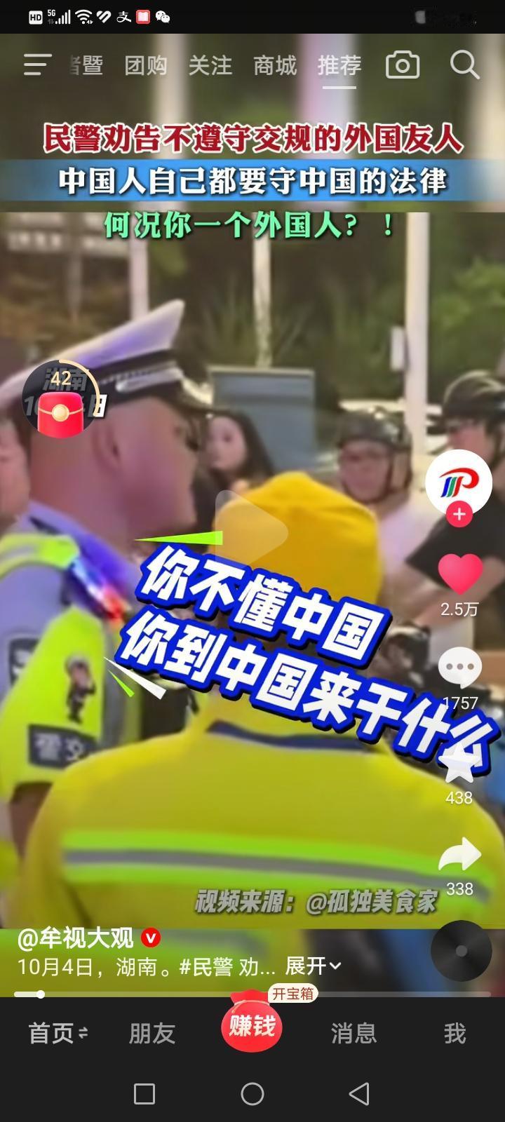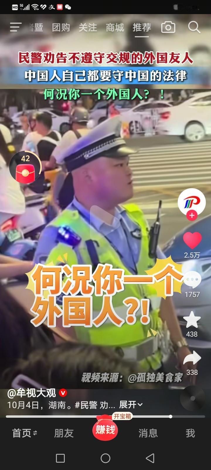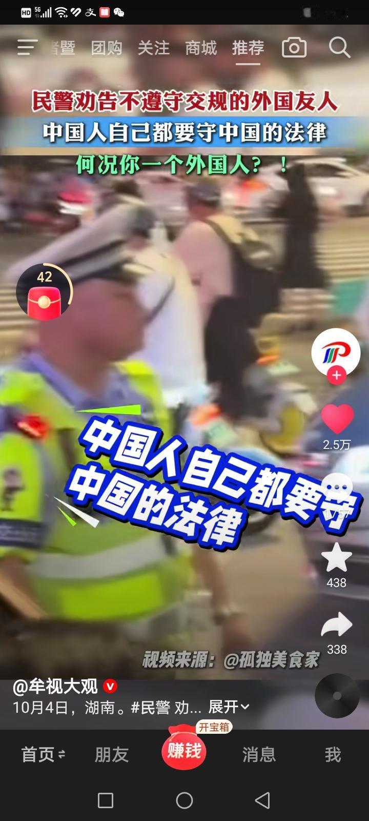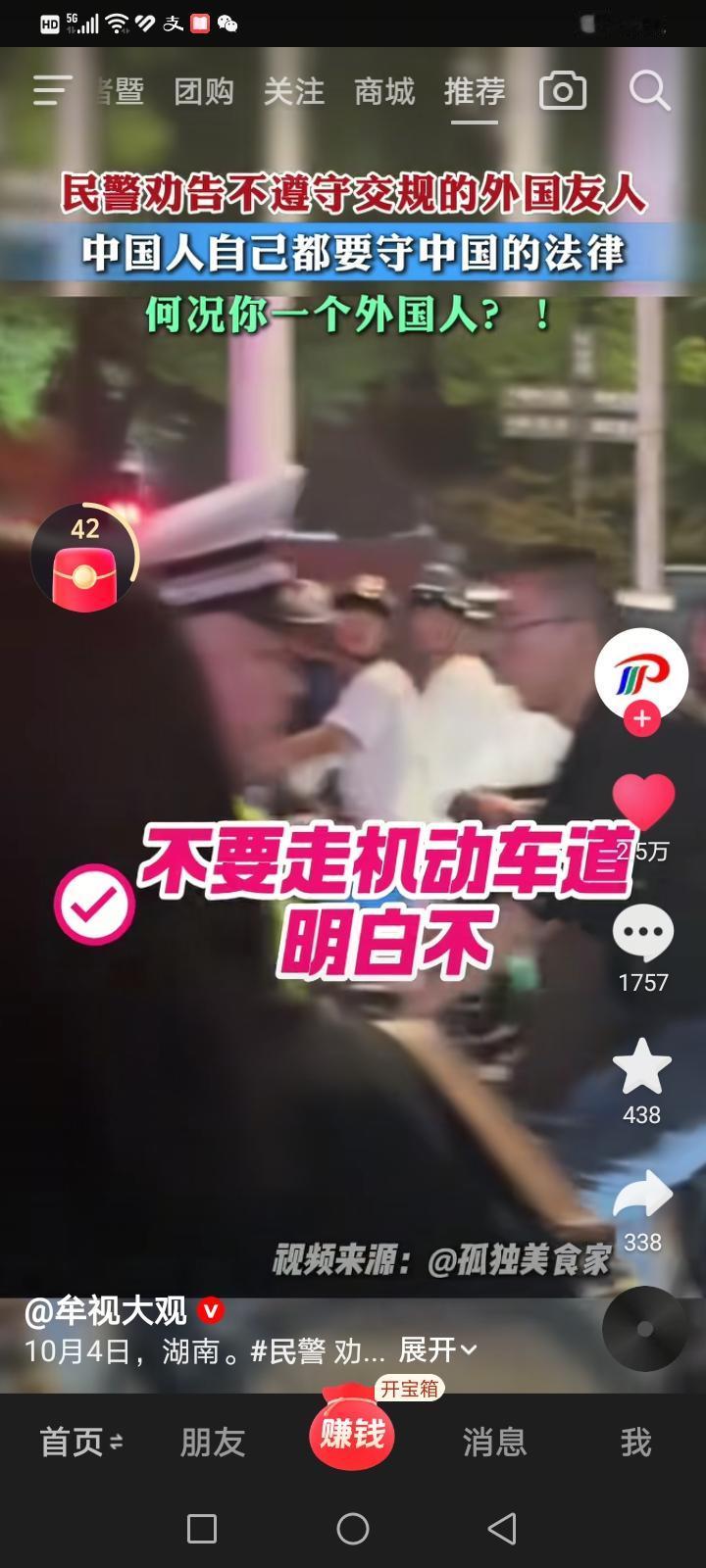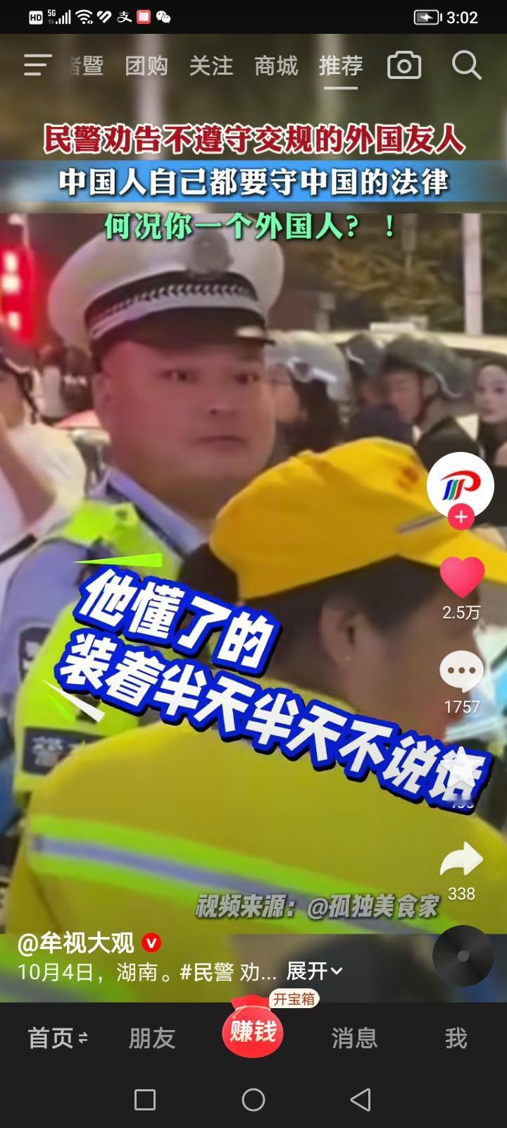 为交警叔叔点赞。10月4日,湖南长沙一名交警劝告一名不遵守交通规则的外国人遵守中国法律。 据视频显示,该外国人骑电动车时未戴头盔且走在机动车道上,交警将其拦住后进行劝告,称“中国人自己都要守中国的法律,何况你一个外国人”,并提醒其在中国骑电动车要戴头盔,不要走机动车道。视频中还提到,该外国人一开始装着不说话,但交警认为他是懂中文的。(图片信息来源:牟视大观报道)外国人行为规范 外国人在华法律 长沙人过马路 中国交通劝导员 外籍人士骑行 外国人交通素养