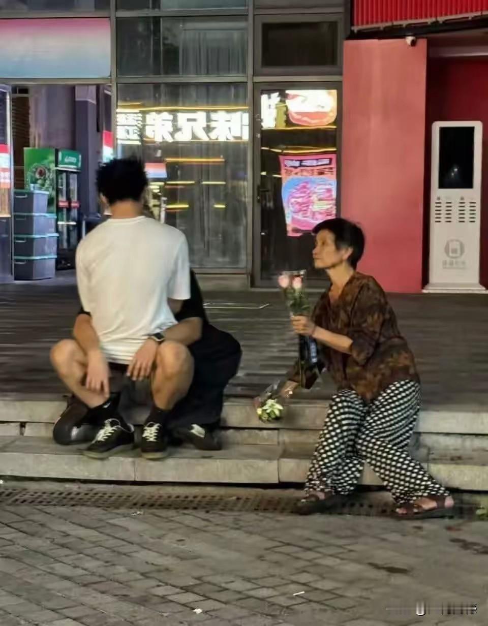 这个老大妈应该是个卖花的,她看到了商机之后,便主动上前来推销她的商品,于是就被有