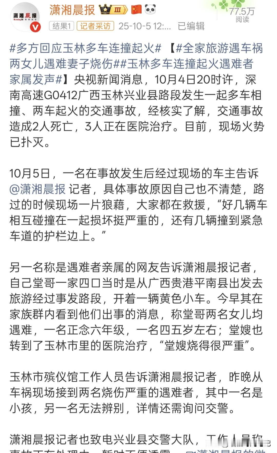 黑色幽灵停在黑夜,一家人的光被连根拔走 “黑色”如果会说话,它一定先道歉: “对不起,我把自己伪装成夜色, 还偷懒不开双闪,像熄灯装睡, 让后来的人一头撞进我的冷漠。” 警示牌?它选择躺平, 于是,高速成了盲盒, 第一辆车“咣当”按下多米诺开关, 后边的钢铁长龙集体失控。 结局没有奇迹,两条小生命, 加减乘除后归零; 一位妈妈,重伤把“团圆” 改写成“抢救中”; 一个家庭,从此缺了三分之一, 剩下的三分之二余生都在漏风。 节假日出门, 我们总想把幸福塞满后备箱, 却忘了先给安全系条安全带。 通报还在路上,但教训已经超速抵达 别让“赶路人”变成“赶命人”, 别让“下一站”变成“最后一站”。 双闪不是舞台灯,它求救; 警示牌不是明信片,它喊停; 黑夜不是遮羞布,它照单全收所有眼泪。 请把这篇转给下一个准备出发的人, 让他替那个再也长不大的小女孩, 把“一路平安”这四个字, 真正平安地送到家。 [原创文章,图源网络]