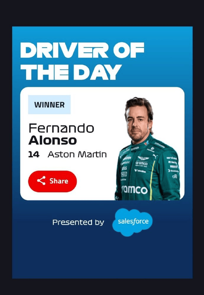 虎扑10月05日讯F1新加坡站正赛后,阿斯顿马丁车手费尔南多-阿隆索获评当日正赛最佳车手。