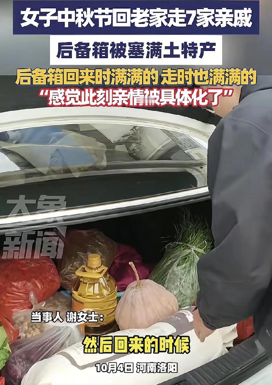 10月4日,河南洛阳一女子返程,小车后备箱装满了满满的土特产,国庆长假啊,回家走了7个亲戚,他们分别送给自己不少的东西,回来时后备箱也是满满当当走的时候后备箱也是满满的爱这就是亲情的具象化,不管是亲情友情有来有往,感情才能维持更长久,如果总是单方面的输出,这样的没感情总会让人觉得疲惫,慢慢的变成了埋怨,终究会变得心凉。