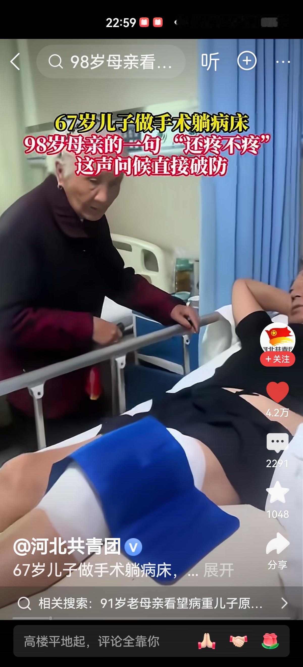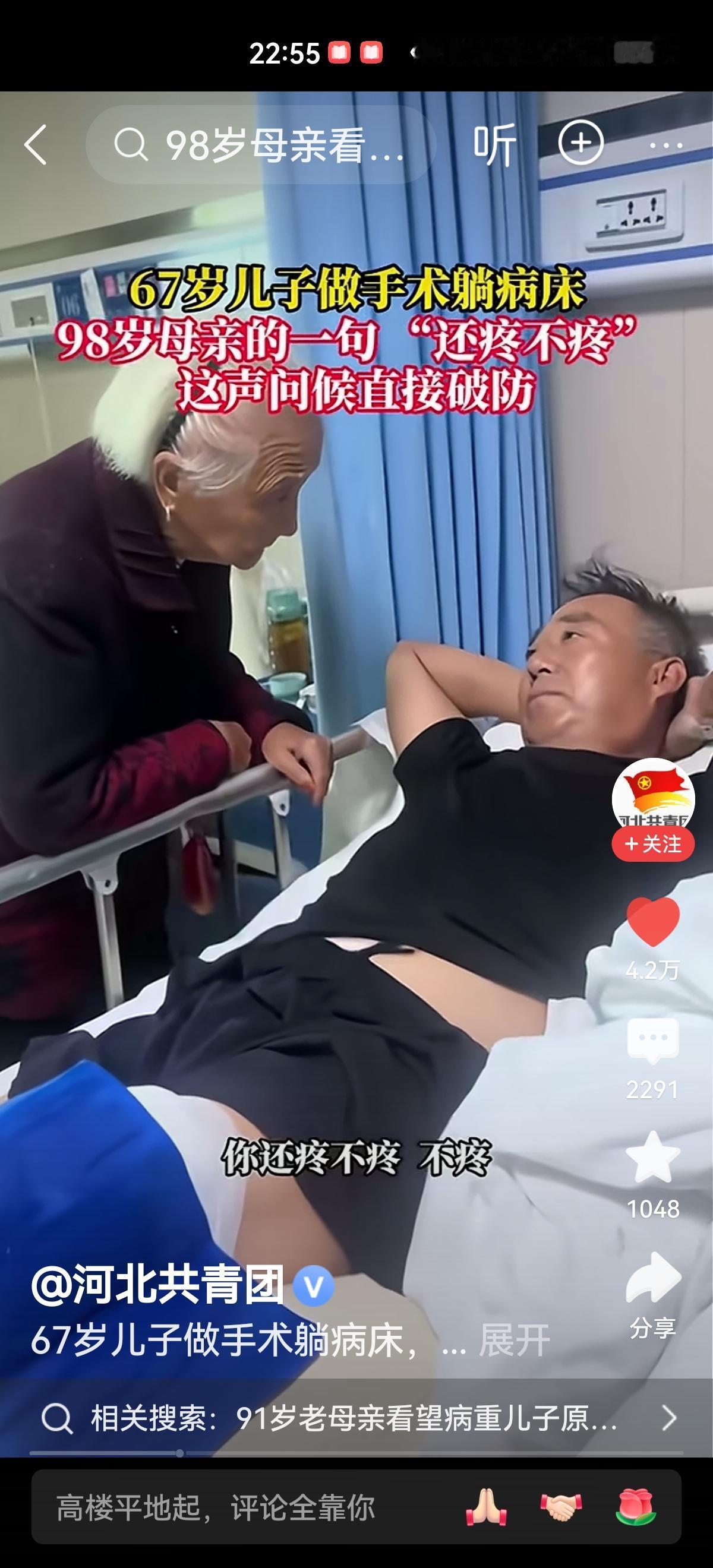 近日,河南一位98岁的母亲,当得知67岁的儿子住院做了手术,不听家人劝阻,拄着拐棍到医院看望儿子。老母亲在病床边俯身问儿子:“还疼不疼?”儿子说:“不疼。”这一问一答之间是母亲满满的爱。不管你多大年纪,只要母亲在,在母亲眼里就永远是个孩子。有母亲的爱真好!
