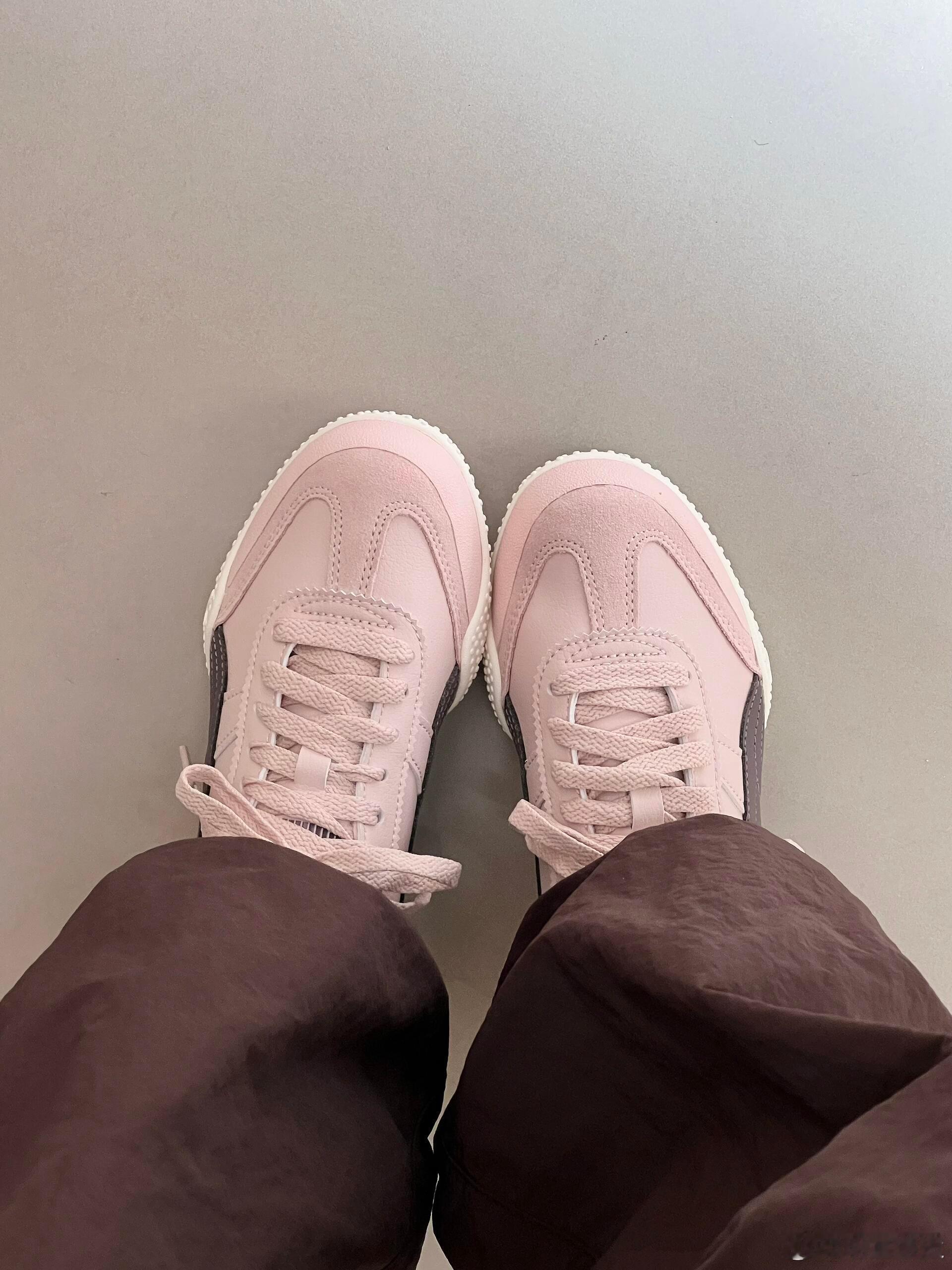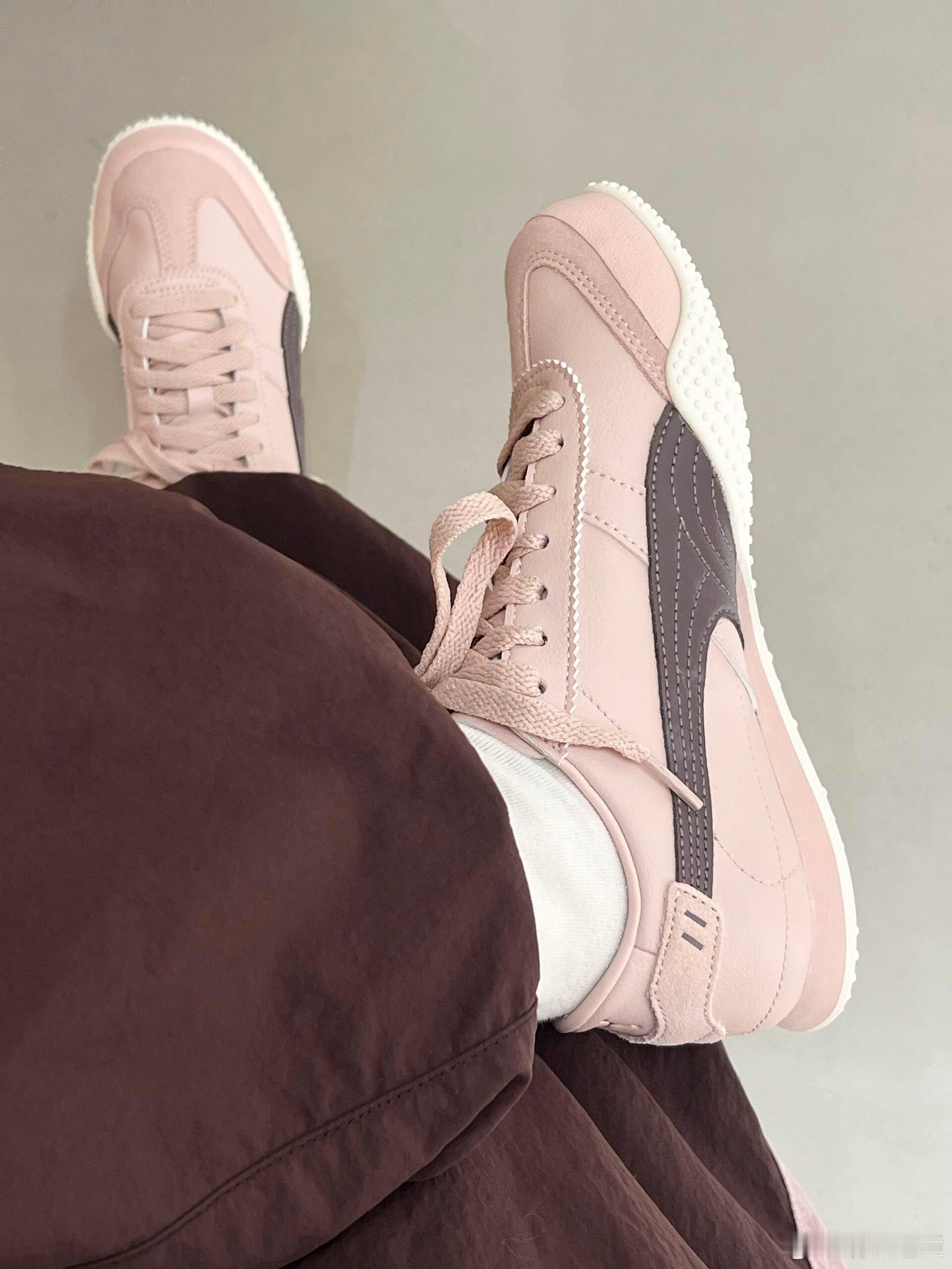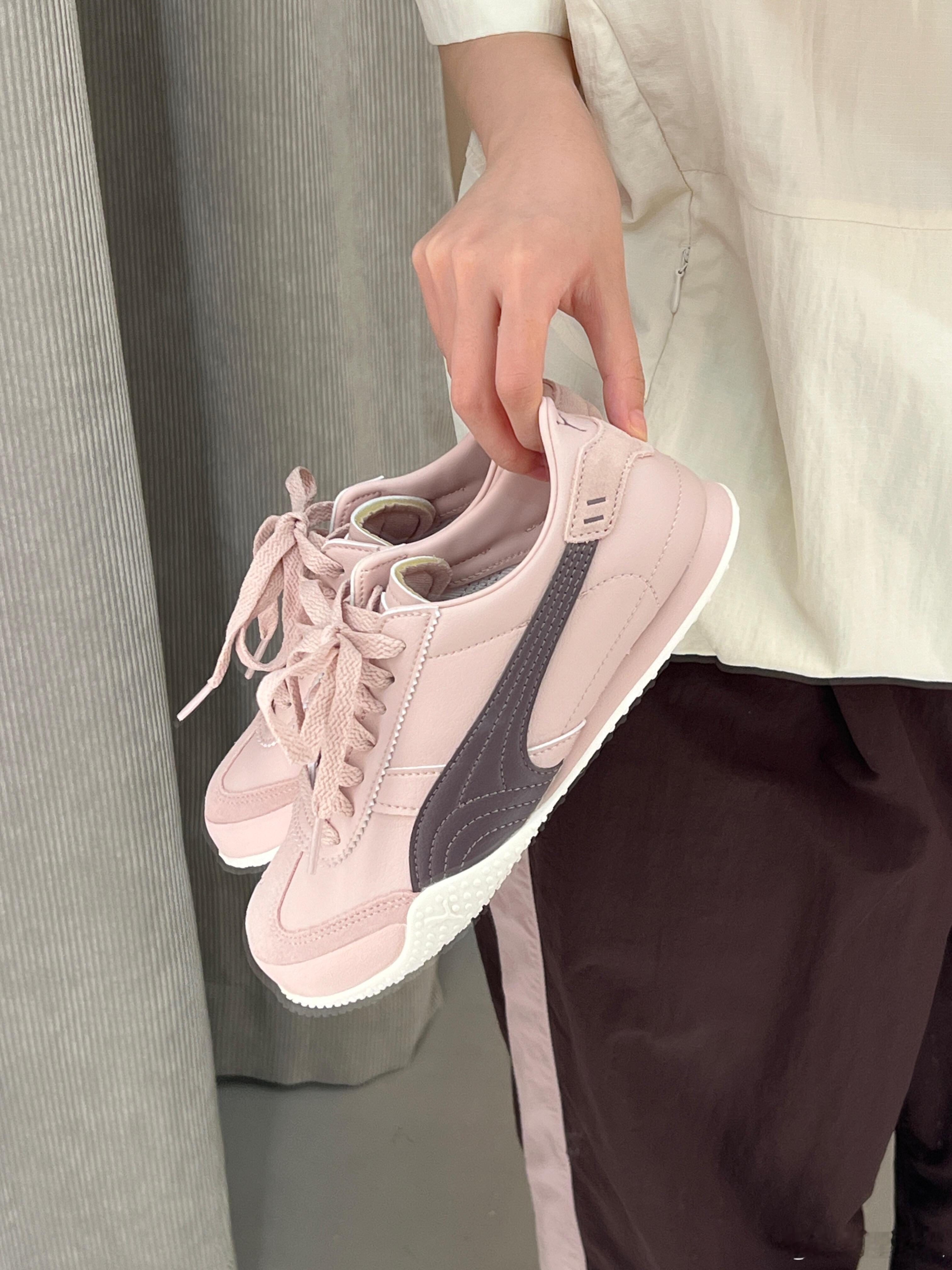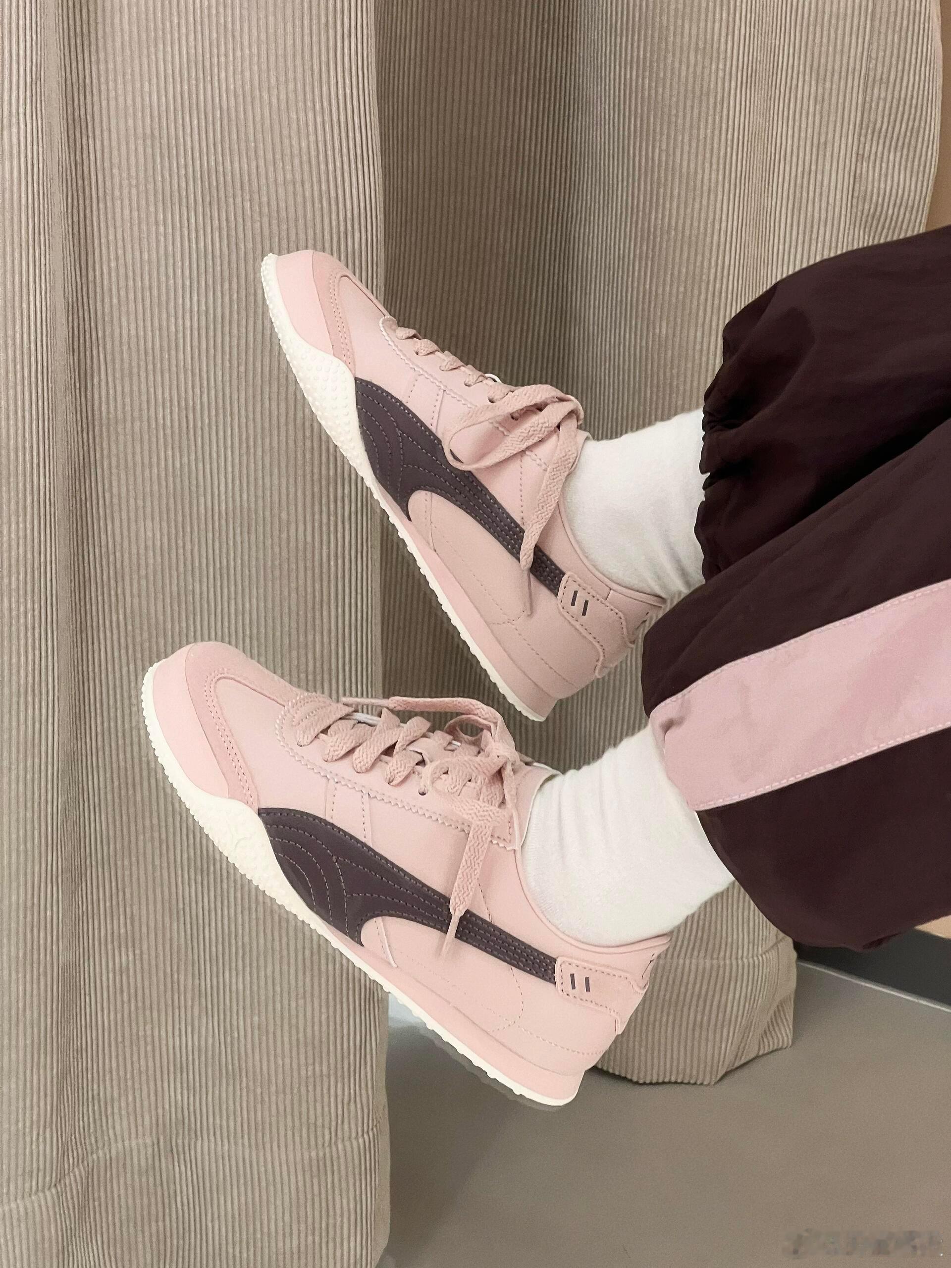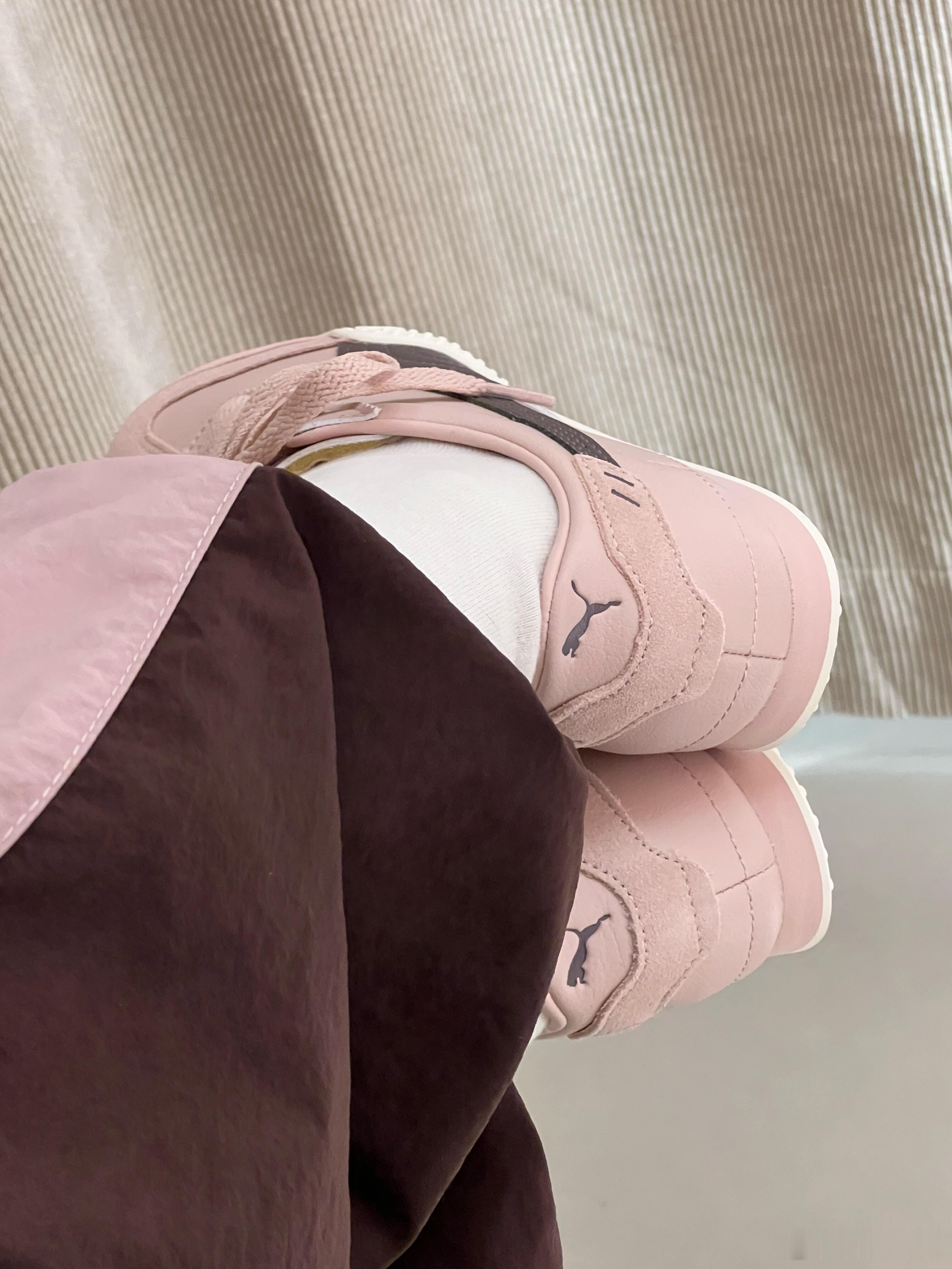 这双浅粉色PUMA运动鞋,以其柔和的色调成为整体造型的亮点。鞋身设计简约利落,侧边饰有深紫色的品牌标志,与浅粉色的鞋面形成优雅对比,同时与鞋带颜色完美呼应。它被搭配以白色袜子和带有浅粉色条纹的深棕色长裤,巧妙地融入了同色系穿搭,展现出清新、时尚且舒适的日常运动风格。