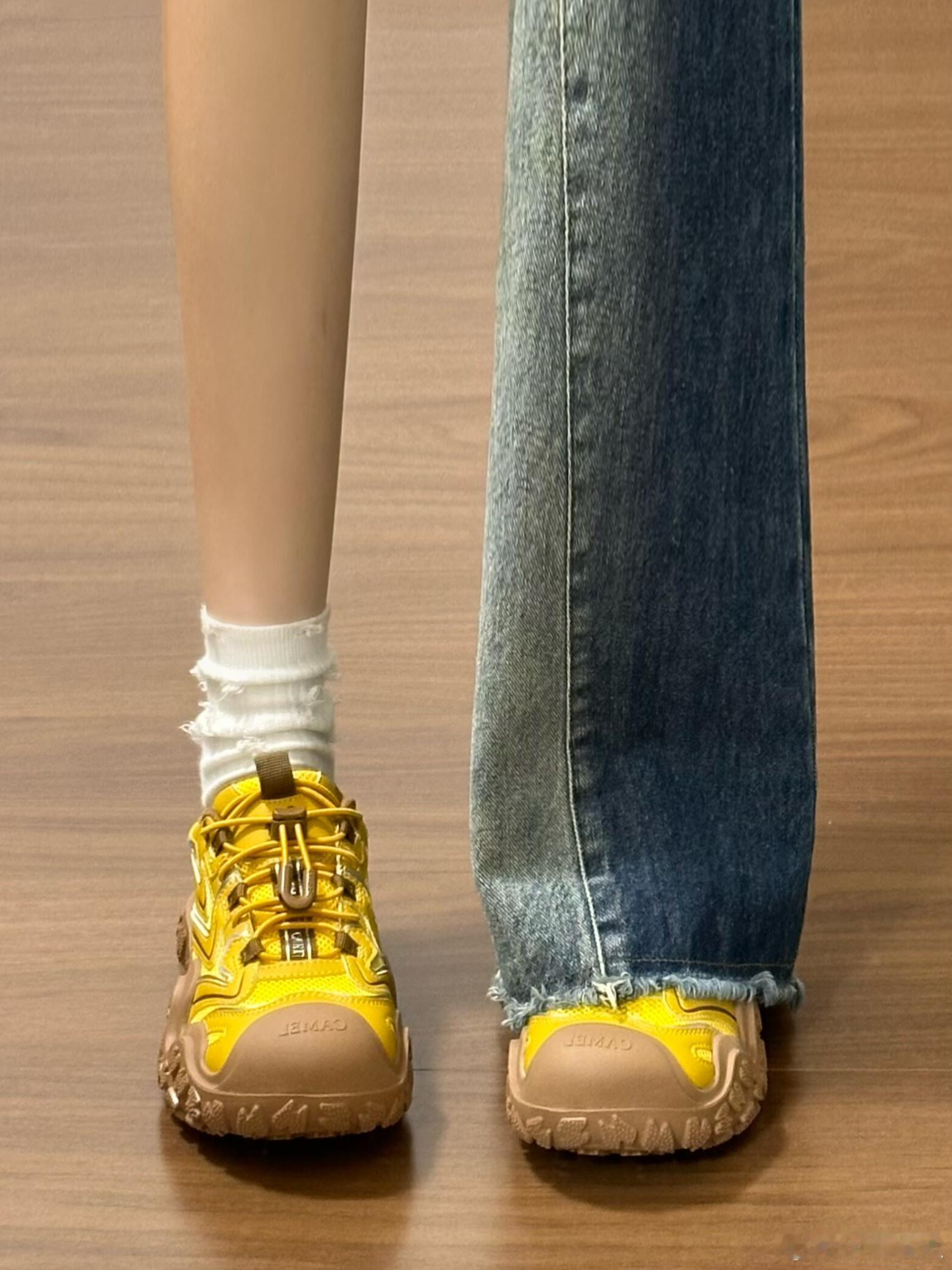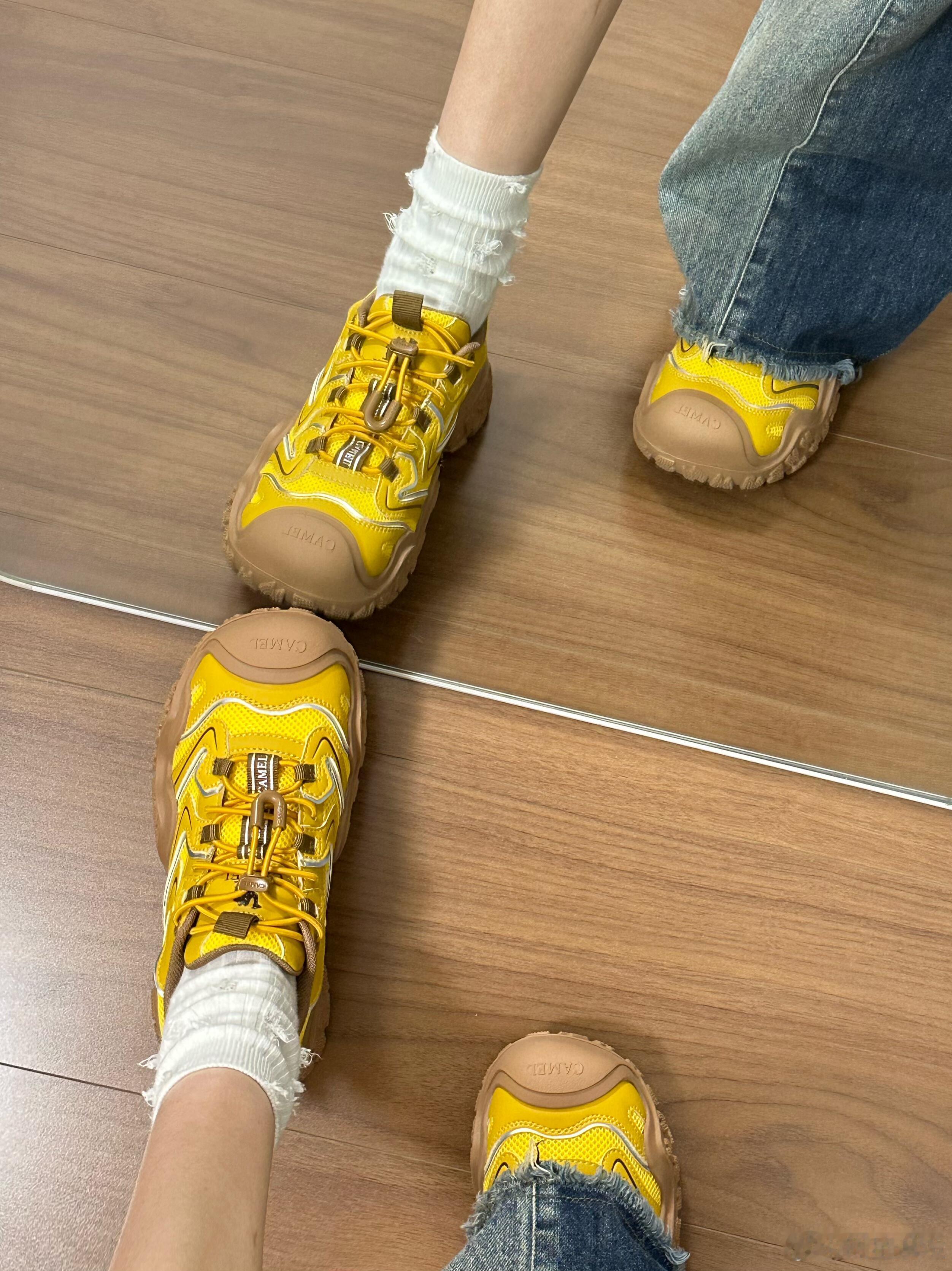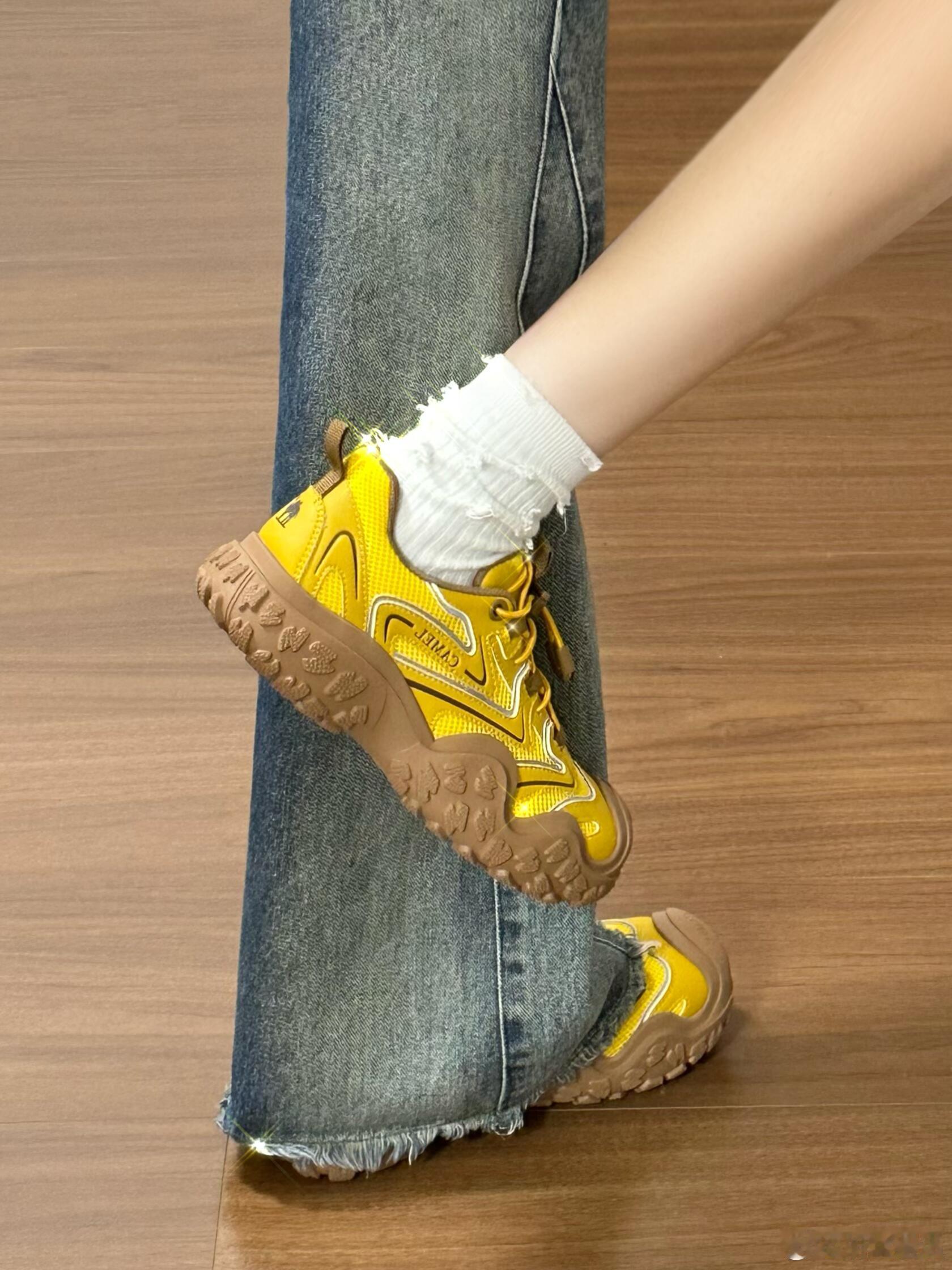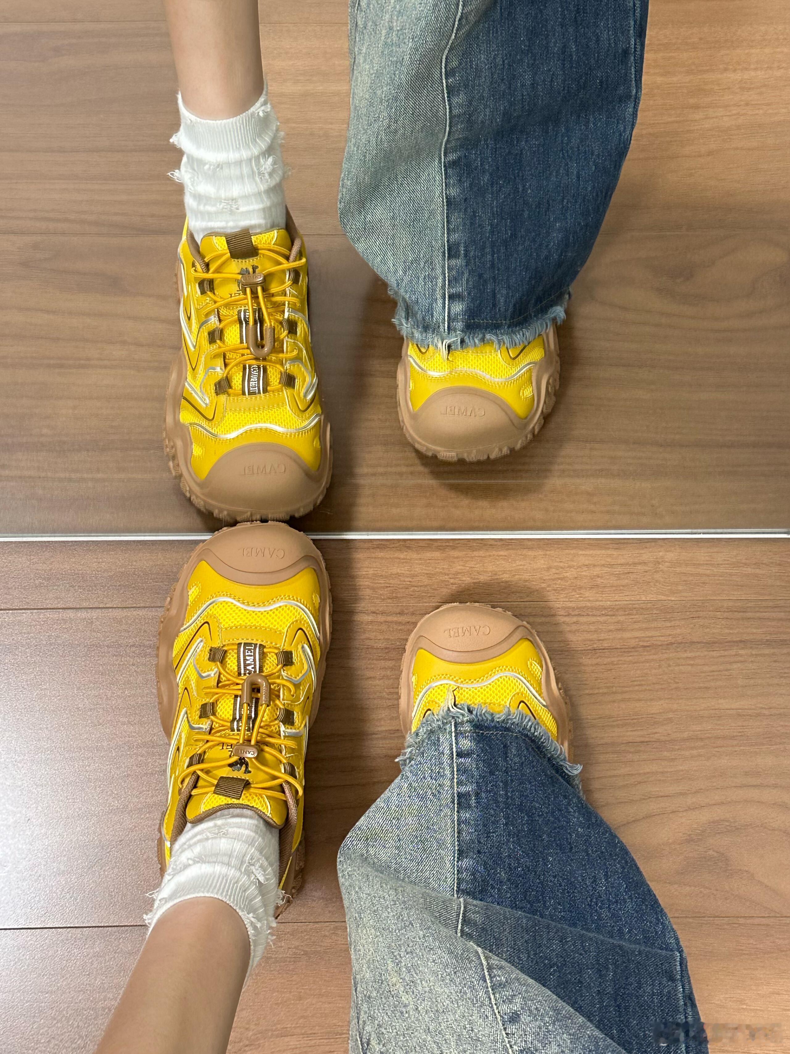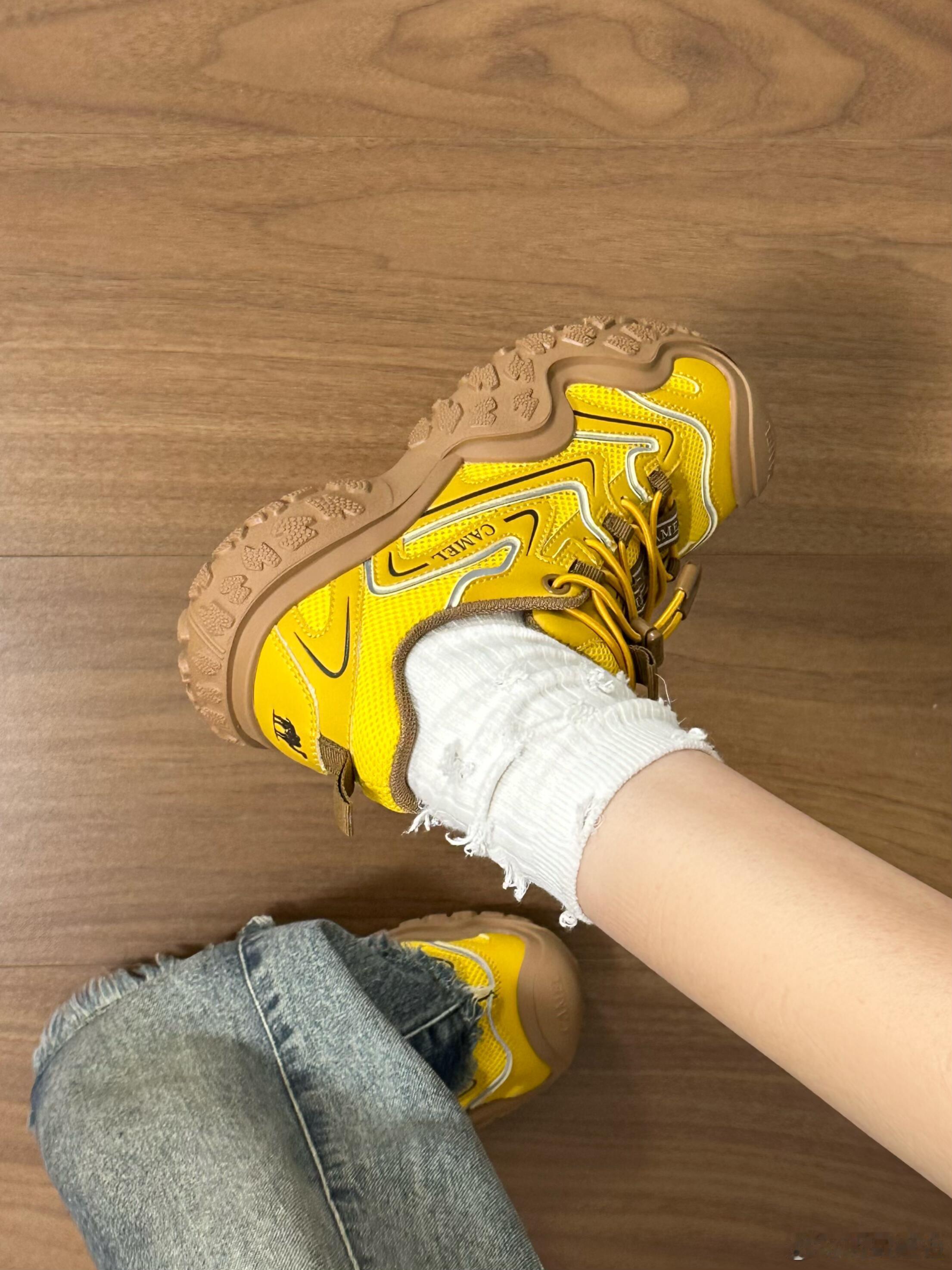 这双亮黄色的COWIE运动鞋以其高饱和度的色彩瞬间抓人眼球,充满青春活力。鞋面采用透气网布材质,保证了穿着的舒适干爽。最为独特的设计在于其深棕色的加厚橡胶鞋头包边与同色系粗犷大底,不仅提供了出色的防护性与耐磨性,更赋予了鞋子鲜明的户外工装风格。