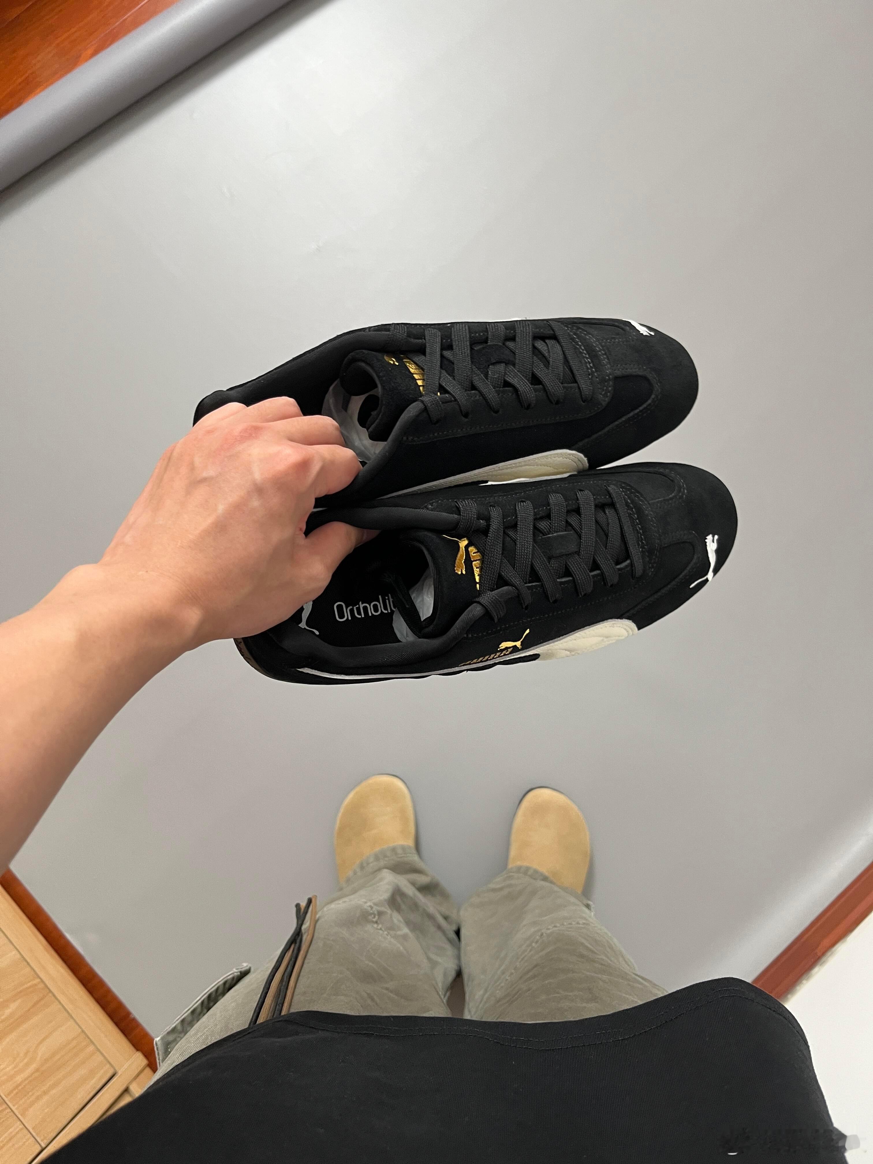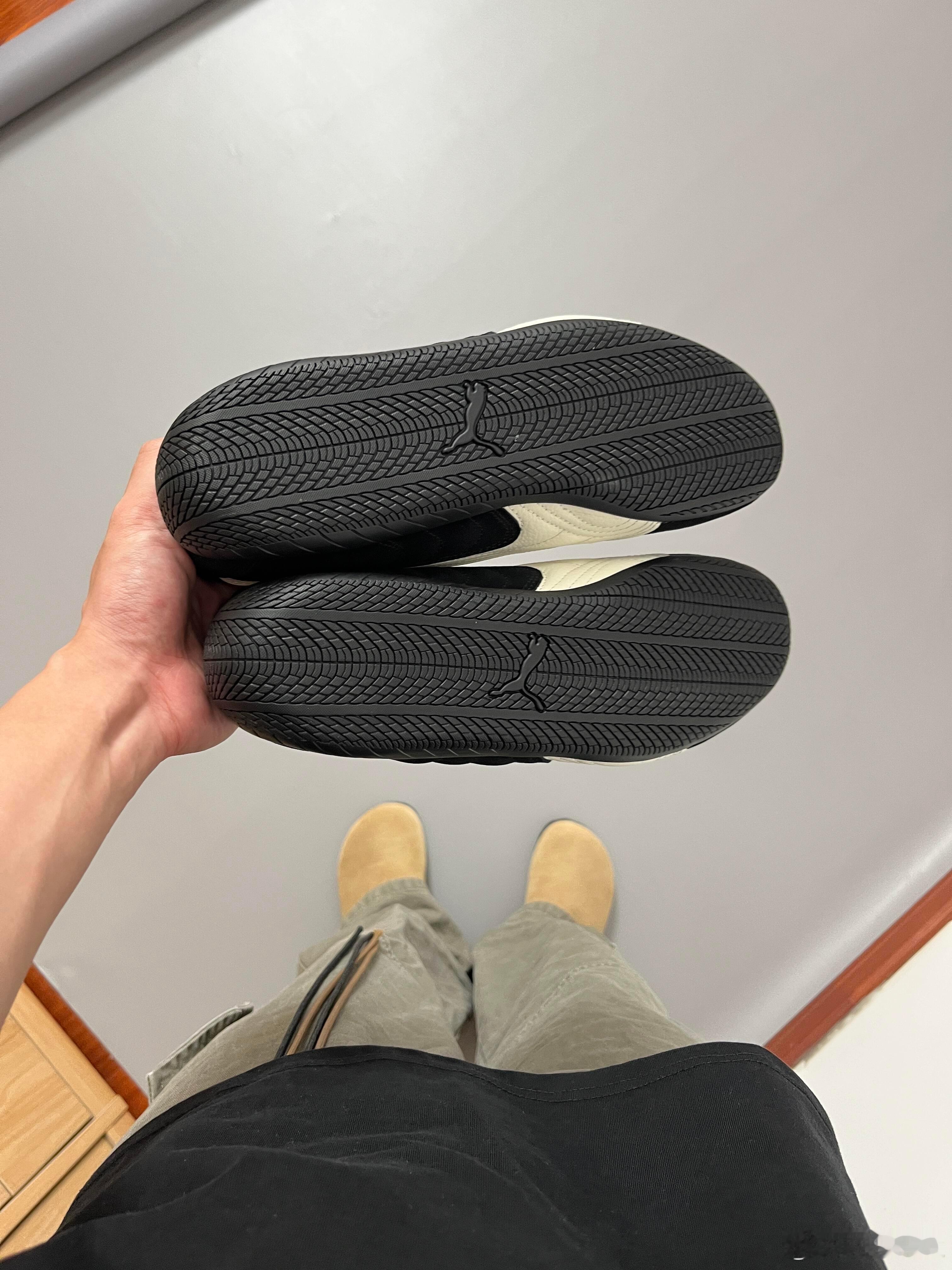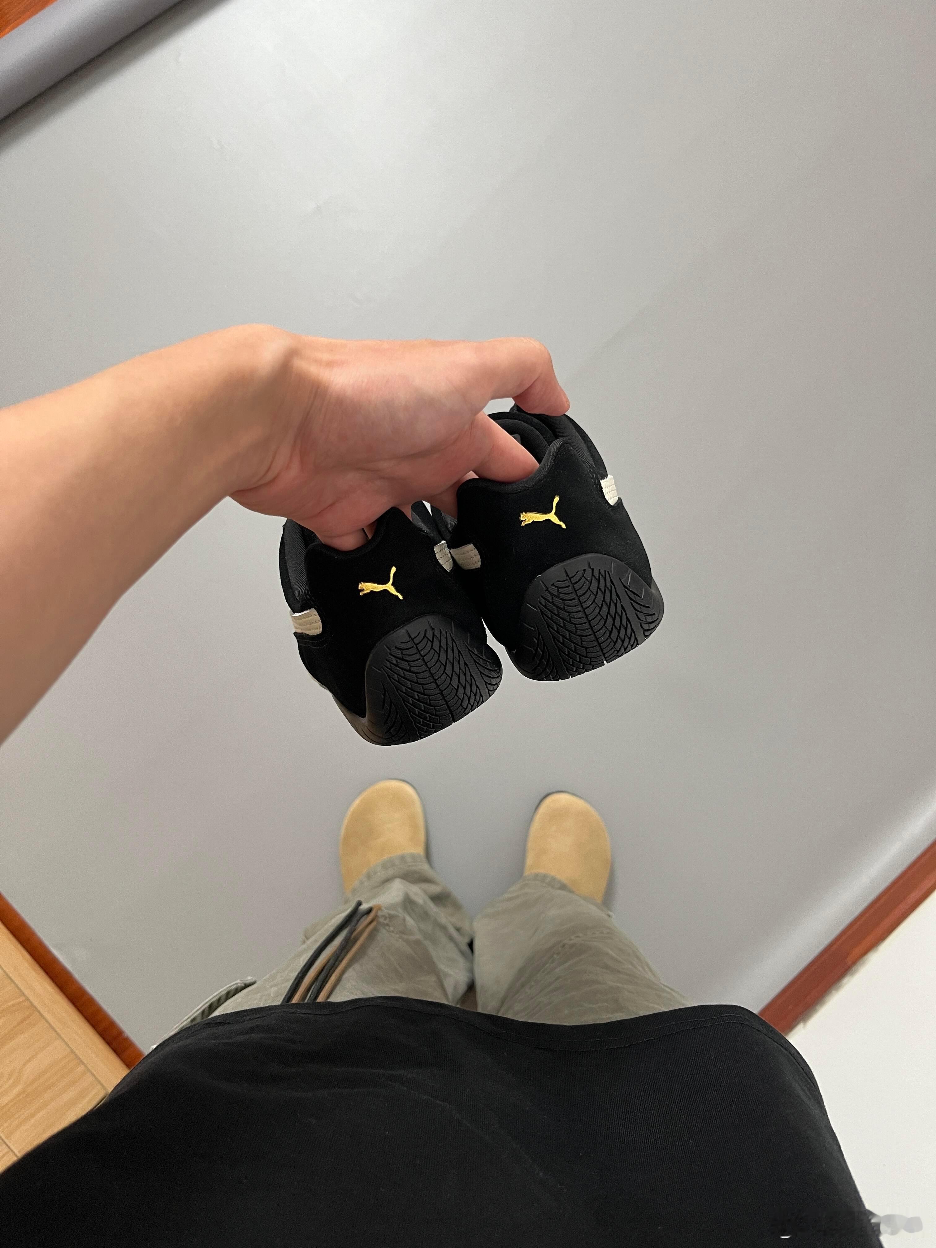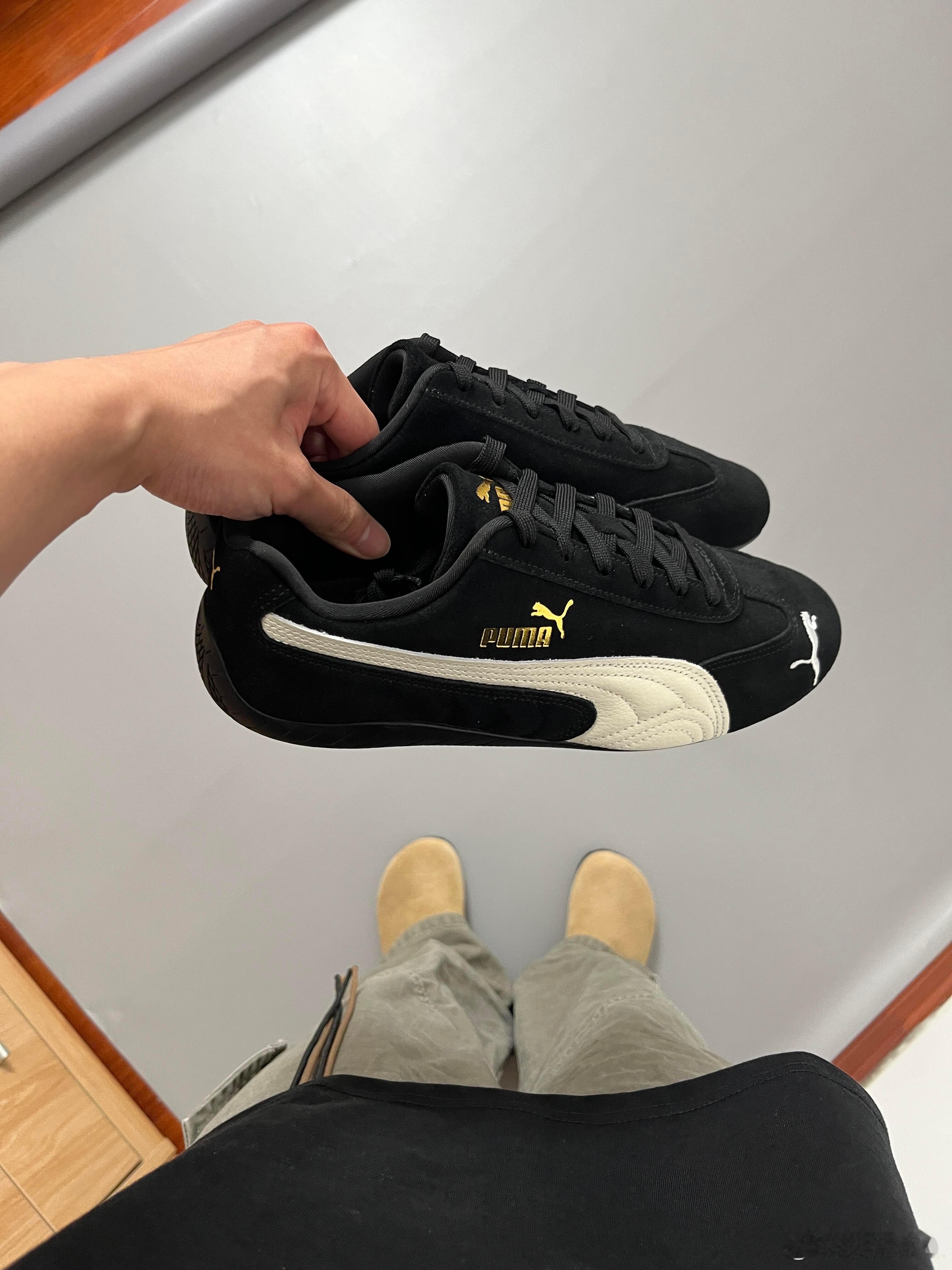 PUMA赛车鞋以其经典的黑白配色与醒目的金色标识,展现出浓郁的复古运动风格。鞋身主体采用质感出色的黑色磨砂皮制成,侧面饰有品牌标志性的宽大白色跑道条纹,极具辨识度。条纹之上,金色的“PUMA”字样与美洲狮Logo尤为夺目,鞋头外侧还巧妙点缀了一个白色美洲狮剪影,细节精致。整体设计简约利落,黑白主色调百搭不过时,金色的加入则提升了整体的奢华与精致感。它完美融合了经典运动基因与现代时尚审美,无论是用于打造复古运动造型,还是作为日常休闲搭配,都能轻松成为整体造型的焦点。时尚鞋履SOTD鞋控的日常