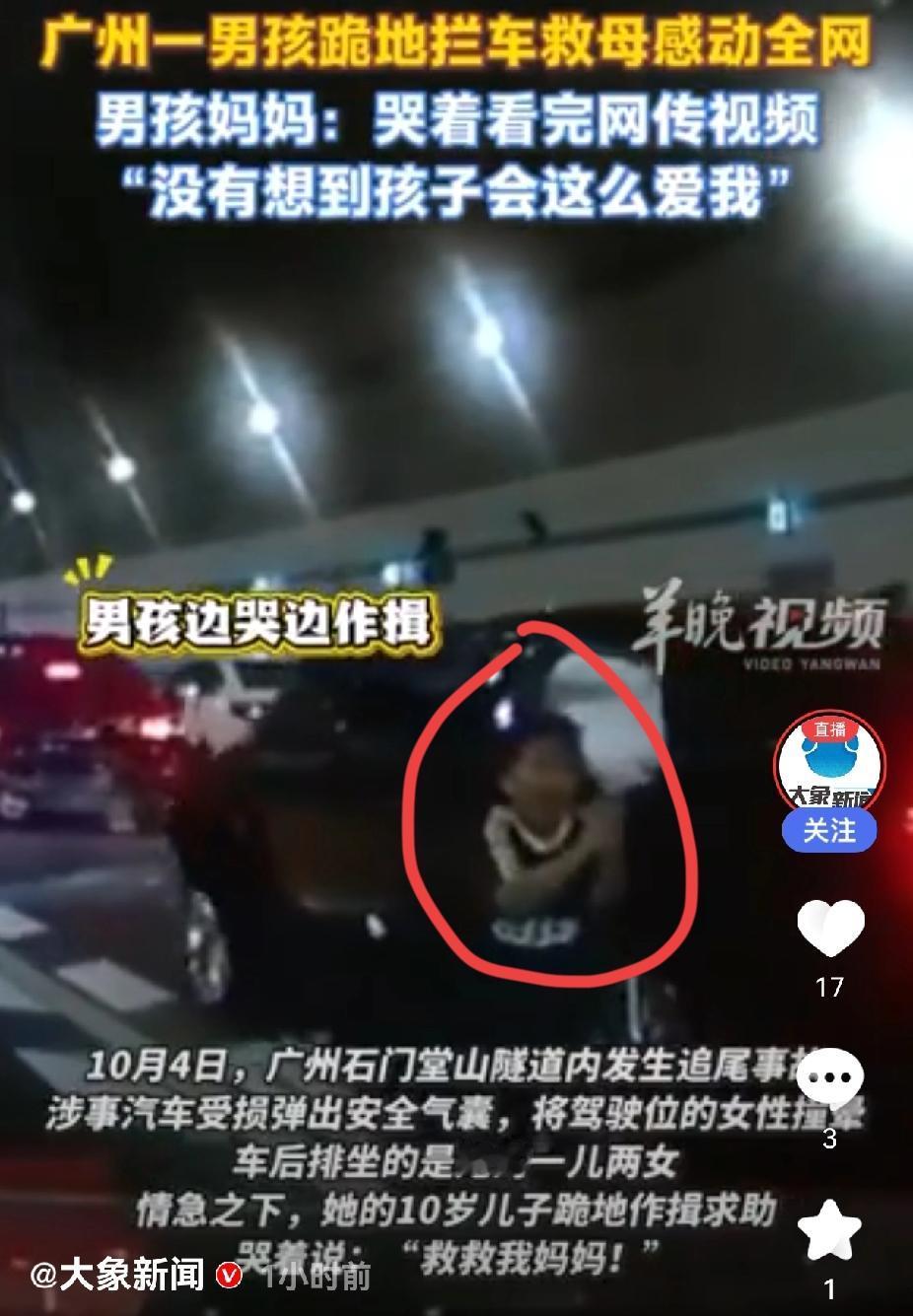 10岁男孩隧道里一跪, 全网破防了! 国庆假期第4天,广州石门堂山隧道发生追尾。安全气囊“砰”地弹开,开车的叶女士瞬间被撞晕,车里还坐着三个孩子。 危急时刻,10岁的儿子直接冲下车,“扑通”跪在隧道行车道上,挥着小手哭喊:“救救我妈妈!”画面显示:穿白衣的男孩在车流中跪地举手,多辆车减速避让 很快,郑女士第一个停车冲过来。她把吓坏的孩子搂进自己车里,轻拍着后背安抚。其他热心车主合力把意识模糊的叶女士扶到安全地带。报警、送医、一场爱心接力在隧道里展开。 郑女士回忆:安全气囊全弹开了,孩子哭得发抖,反复说“要救妈妈” 头上还缠着纱布的叶女士红着眼眶说:“儿子从来没那么勇敢过。我问他怕不怕,他说:‘怕,但更怕没有妈妈了’。” 隧道里跪下的那个瞬间,是一个孩子对母亲最本能的守护。而陌生人毫不犹豫伸出的手,让这场意外有了温暖的结局。 为小男子汉的担当点赞!也为所有出手相助的普通人点赞!