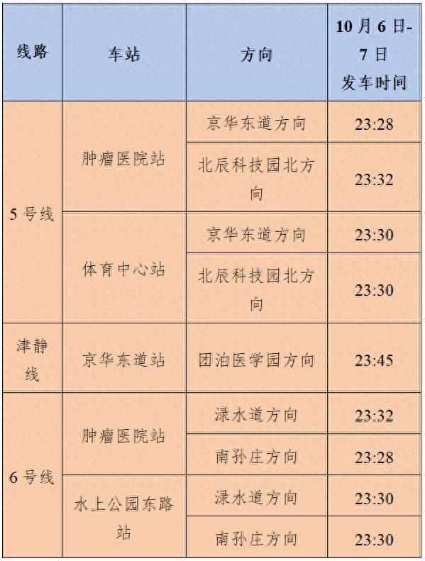 10月6日-7日地铁5、6号线重点车站末班车时间表