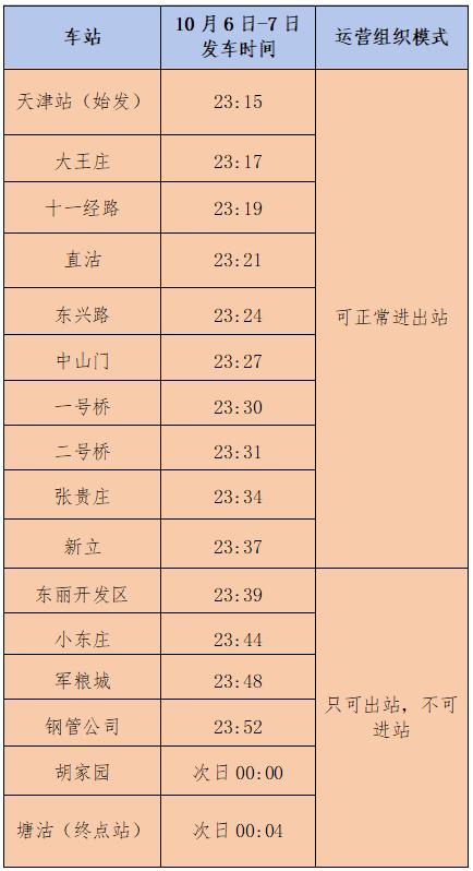 10月6日、7日,地铁9号线23:15由天津站开往塘沽方向的晚间直达快车调整为站站停客运列车,其中,天津站至新立站,乘客可正常进出站;东丽开发区站至塘沽站,乘客只可出站,不可进站。由直沽站开往天津站方向的末班车时间调整为23:51。