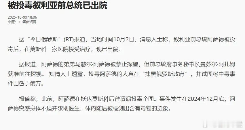 重磅消息!俄罗斯承认阿萨德被投毒!多家俄罗斯媒体在报道中承认,叙利亚前总统阿萨德此前确实被投毒,但在报道中强调,阿萨德已经安全出院。此外,相关报道中称,投毒者的目的非常明确,就是为了在阿萨德抵达莫斯科避难之后,故意用类似的手段栽赃俄罗斯政府、将阿萨德中毒的事件归咎于俄罗斯。