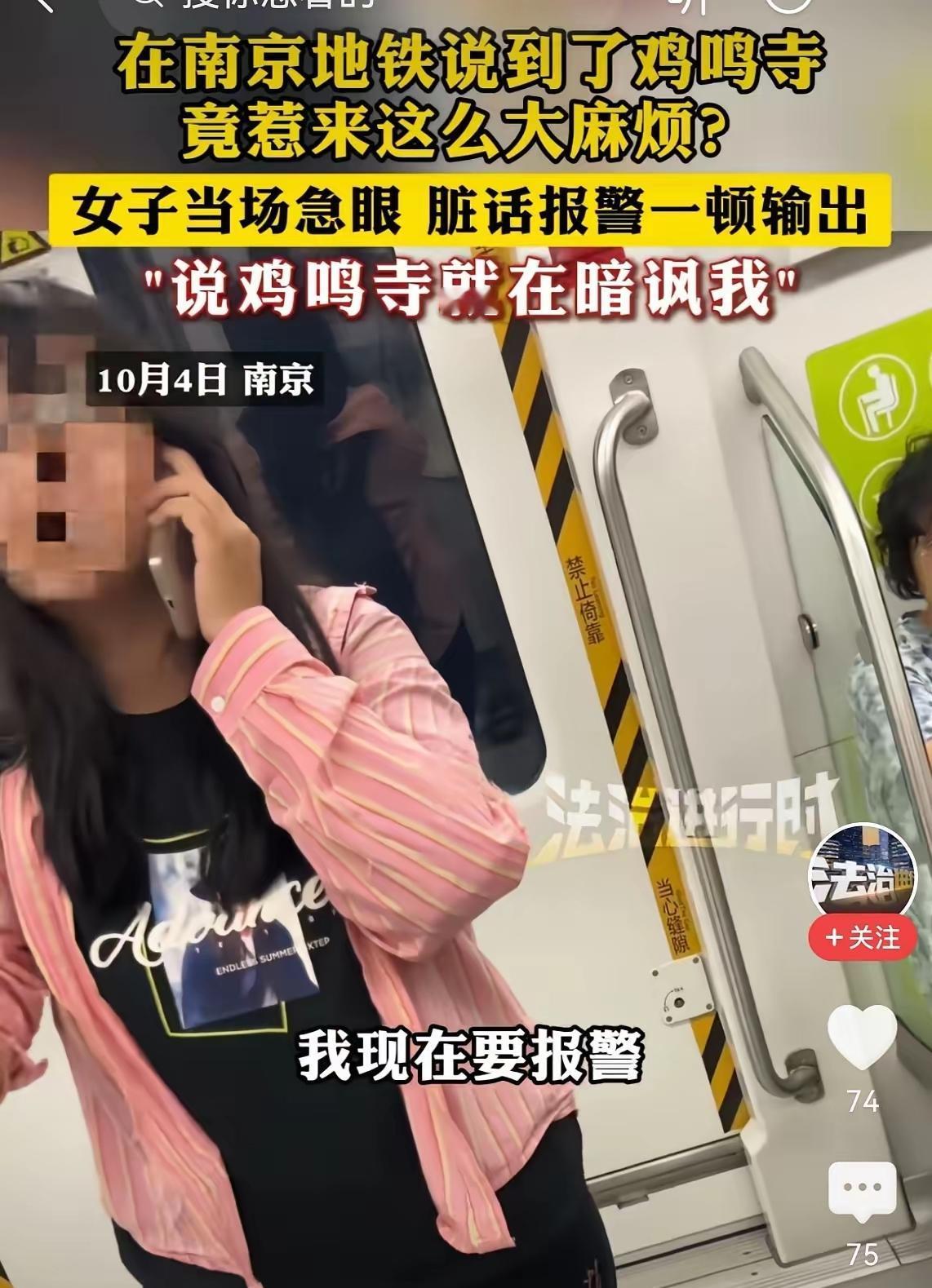 地铁上聊个天,差点被抓走? 俗话说“秃子忌说光”,人越缺什么,就越怕别人说什么。这粉衣女为啥一听“鸡鸣寺”就炸毛? 最近南京地铁上出了件奇葩事。 一家子游客坐地铁,商量着行程。说到“鸡鸣寺”站下车,旁边一位穿粉衣服的女士不干了。 她“噌”地站起来拦住他们,非说人家提到“鸡”字是在骂她。当场掏出手机就报警,说被陌生人用站名“暗讽”。 游客一家都懵了:“站名不让念?哪有这道理!” 粉衣女子振振有词:“我要是对你叽叽叽,你乐意吗?” 还反问人家丈夫:“我说你是鸭,你生气不?” 吵了几句,估计自己也觉得没劲,车一到站,她赶紧溜了。 网友疑惑她为啥反应这么激烈? 根儿上,是她自己先把“鸡”这个字和某些不雅的词汇划了等号。 她潜意识里觉得这个字是骂人的,所以一听别人说出来,就立刻对号入座,觉得是在说她。 说实话,这种因为一个词就炸的事,现实也不少。 有网友发自家黑猫照片,被人追着骂“种族歧视”。有顾客在饭店喊了声“裴姐”,老板娘以为骂她“赔钱货”,差点打起来。 说到底,就是太敏感,总觉得别人在指桑骂槐。 鸡鸣寺是南京有名的古寺,站名用了多少年。 心里阳光点,路上才能走得舒服。您说是不是?