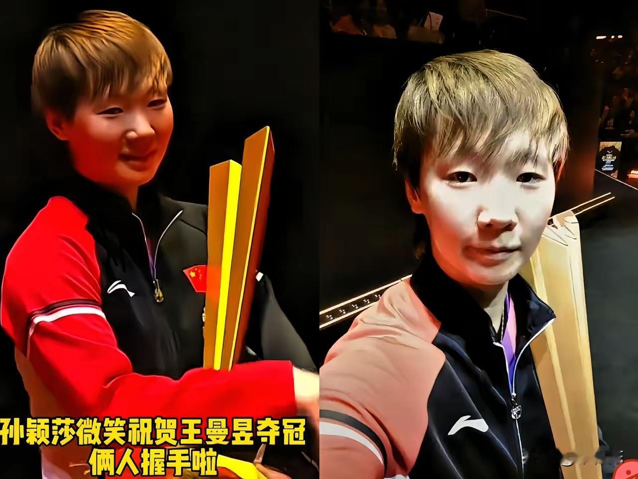王曼昱女单夺冠,最高兴的莫过于4个人 动人的从不是冠军本身,而是背后那四份藏不住的开心! 这哪是一个人的胜利,分明是“成长共同体”的集体加冕。 孙颖莎:27次交锋磨出锋利双刃石。彼此成就、相互激励是王曼昱如今的状态如此之佳、进步如此之快的重要原因。 孙颖莎一直以来都是王曼昱最强大的对手,也是她最先发现、最先激发王曼昱比赛欲望和斗志的“磨刀石”。 正是有了这样的对手,曼昱才能在一次又一次的失败中总结经验、不断突破,成为如今攻防兼备、行云流水的女单世界第一。 新教练任浩:用AI分析把正手得分率提升到75%。王曼昱的进步还有另一个重要原因,那就是新任主教练任浩。任浩上任后第一件事就是利用AI对王曼昱的技术动作进行分析。 在他有针对性的指导下,曼昱如今的正手得分率已经提升到了75%,这让她在不改变自己风格打法的前提下,攻防兼备、全面发力,成为了真正意义上的“女超人”。 王励勤:看到曼昱这几场比赛打得这么稳,我觉得我当初没有看错人。这句话不仅是对王曼昱稳健心态的肯定,更是对她如今出色成绩的认可。毕竟当初提拔她进入国家队的就是王励勤教练。 现在看来,曼昱不仅没有辜负王老师的培养和提拔,还用自己的努力证明了王老师的眼光果然没错。 此役胜利,曼昱收获2000积分,这场比赛的胜利固然离不开她个人的努力,但更离不开团队给予她的支持和信任。 你觉得这四人里,谁的开心最戳你?