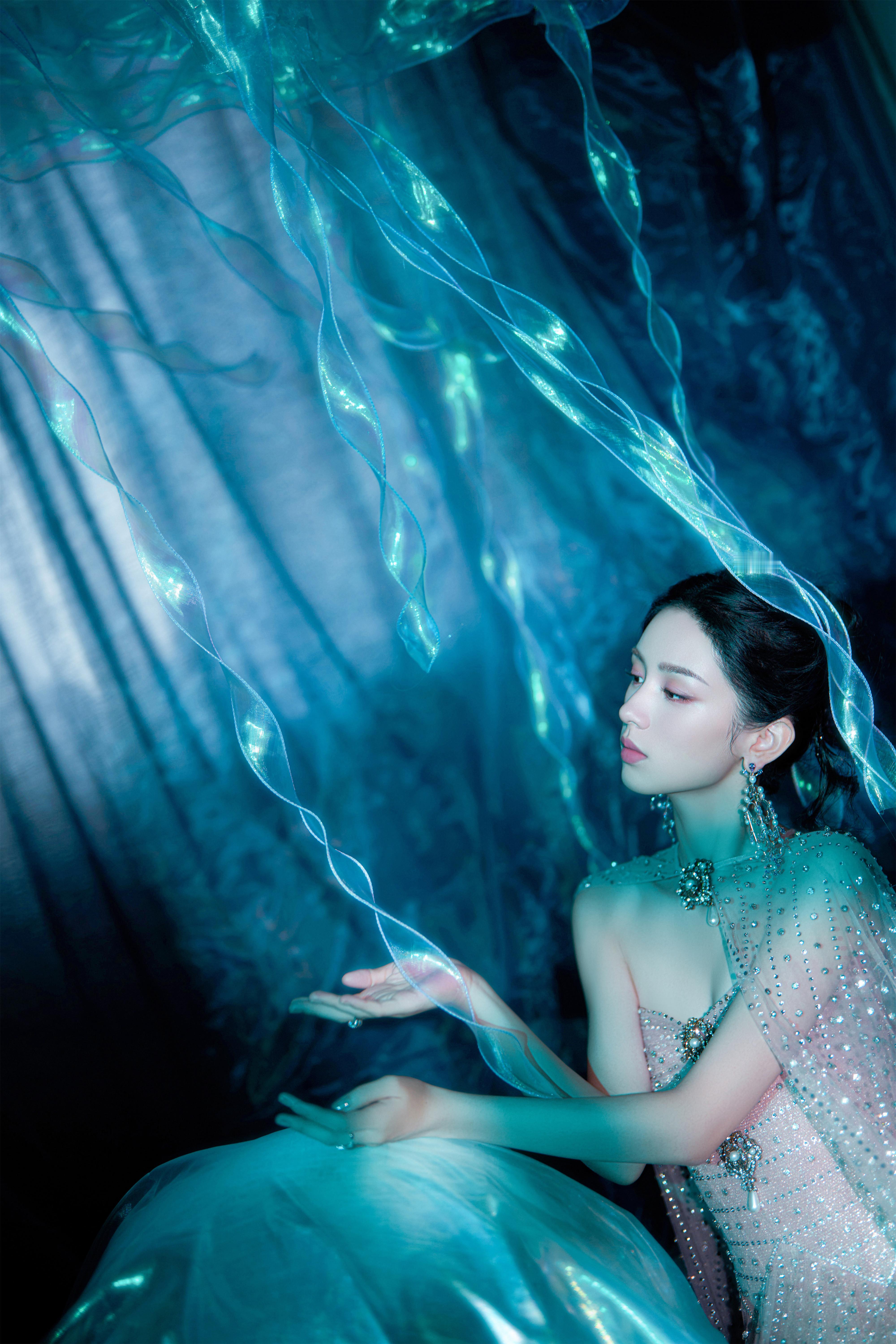 周也星钻纱裙,碧波微澜,水光如幻,聆听海的轻语