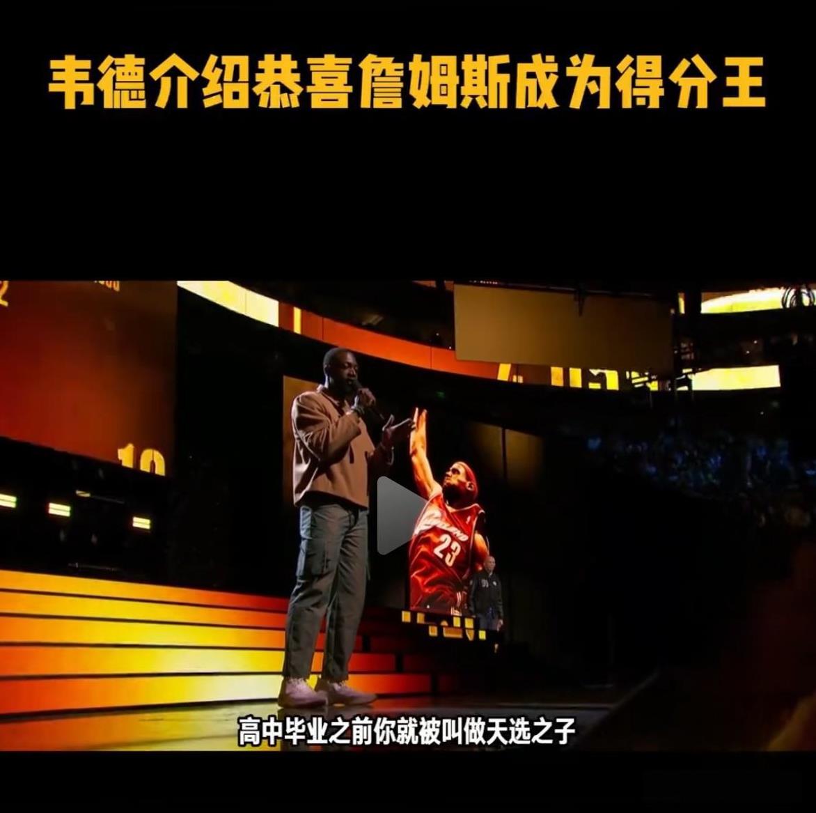 韦德主持勒布朗成为历史得分王太燃了: 贾巴尔在1984创造了NBA历史总得分记录38387分。 同时那一年一位未来之星出生了——他就是我的好兄弟勒布朗詹姆斯!高中毕业之前他就是天选之子!也让大家充了无数期待!他不仅是四届MVP得主!也是4届FMVP得主!21次全明星,13次一阵球员!同时他也是儿子、父亲、丈夫,现在他成为历史得分王我们祝福他吧!